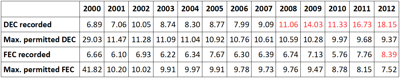 An analysis of these indicators for the concession area of Light, the electricity distribution company for the city of Rio de Janeiro, highlights its mediocre performance. In 2012, stood in 32nd place (out of 35) in the league table of companies for the quality of electricity supply, published annually by ANEEL, and 34th place in 2013. While ANEEL demands continual improvements in service quality, reflected in the downward trend in maximum permitted DEC and FEC values visible in the table below, the reality is that service quality levels generally deteriorated throughout the 2000s.