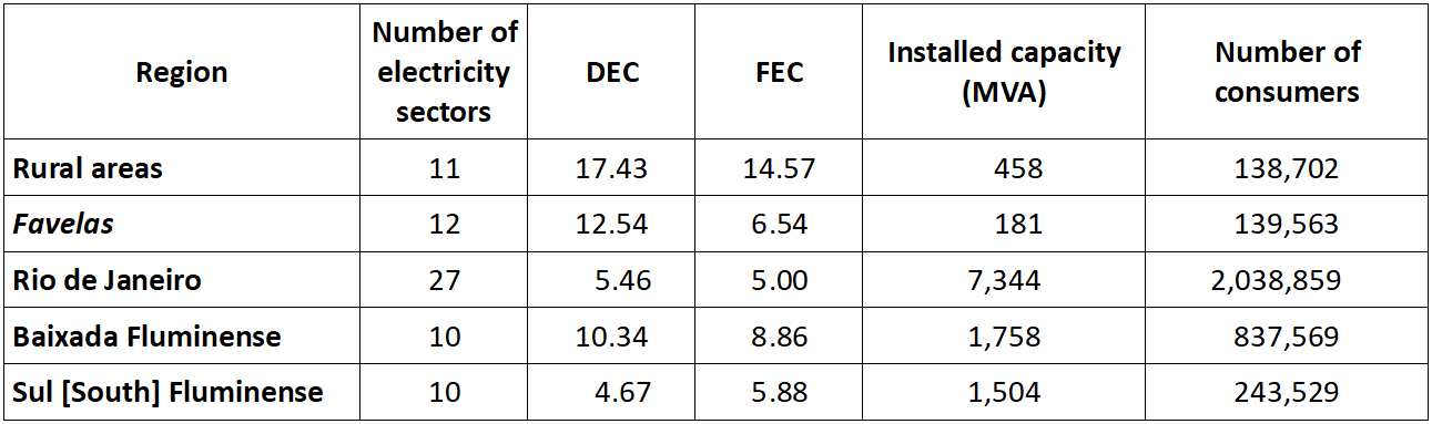 The table below shows the DEC and FEC values for these three favelas (Chapéu Mangueira, Babilônia, and Santa Marta) and the difference between these figures and the average values for the Light concession area as a whole.