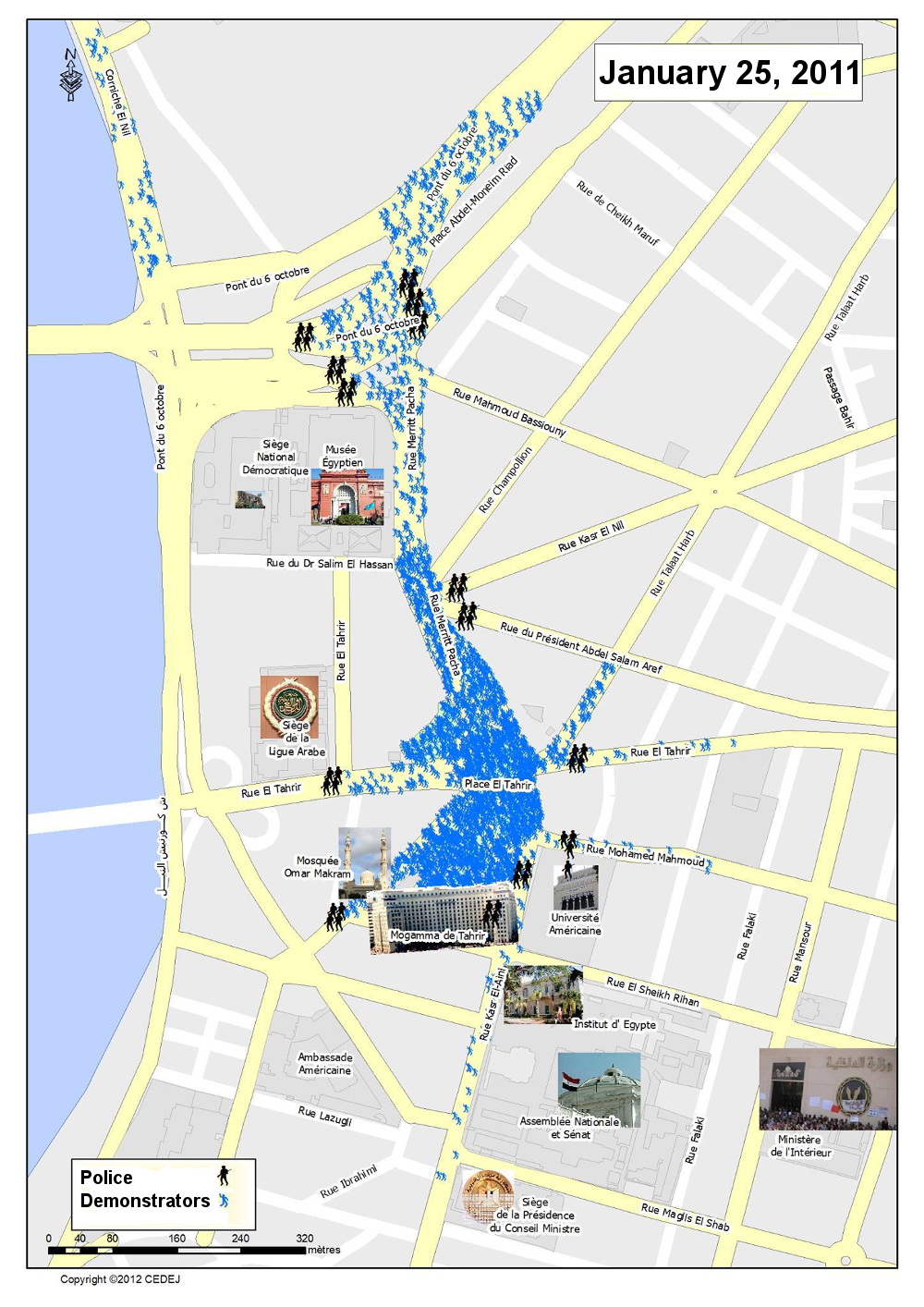 By the end of the 2000s, Egyptian activists had acquired a deep-rooted, practical sense of spatial constraints. They knew that choosing a protest site had several consequences. Depending on the location, the protest’s attractiveness to outsiders would vary; the manageability of the protest by police forces would be more or less easy; and the protest itself, depending on its morphology, would seem more or less important. Marching down narrow streets doesn’t feel or mean the same as demonstrating along broad avenues. The choice of starting points for the January 25, 2011 protests was the subject of intense debate among activists. Some wanted to stick to the usual spots in downtown Cairo, while others suggested departing from working-class neighborhoods in the city’s outskirts. (El Chazli 2012, pp. 85–88) They eventually chose to organize marches that would end on Tahrir Square, instead of calling for the usual sit-ins in front of the Journalists’ Syndicate or the High Court (Deboulet and Florin 2014). [2] The way in which the first protests were organized no doubt played an important role in their success.