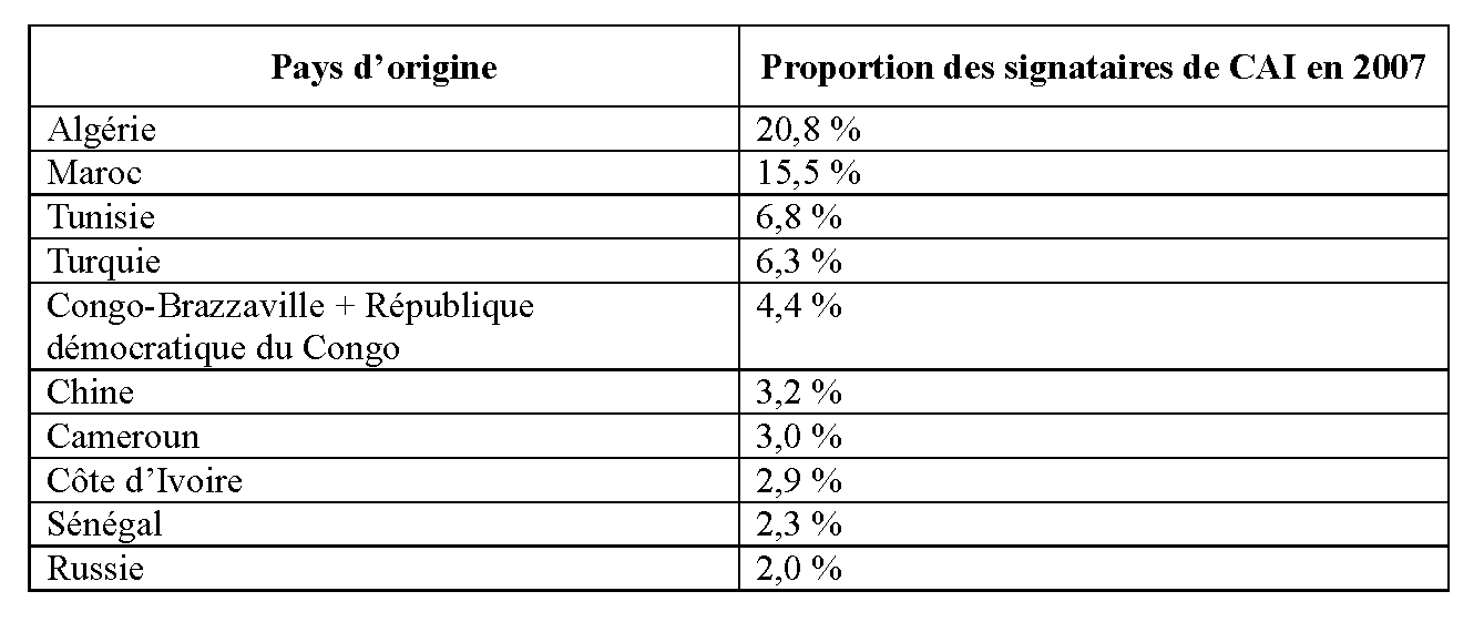 A comparison of the nationalities of RAIC signatories between 2007 and 2017 is also revealing of the central share of this ordinary immigration, even though, it should be remembered, the scheme does not concern people from the European Union. In 2007 (Figure 3), 43.1% of RAIC signatories came from the Maghreb, followed by Turkey (6.3%). People from sub-Saharan Africa, in particular Cameroon, the two Congos, Côte d’Ivoire, Mali, and Senegal, accounted for 14.8% of RAIC signatories; people from Russia and the former USSR made up 4.4% of the total, and from China 3.2% (General Secretariat of the Interministerial Committee for Immigration Control 2008).
