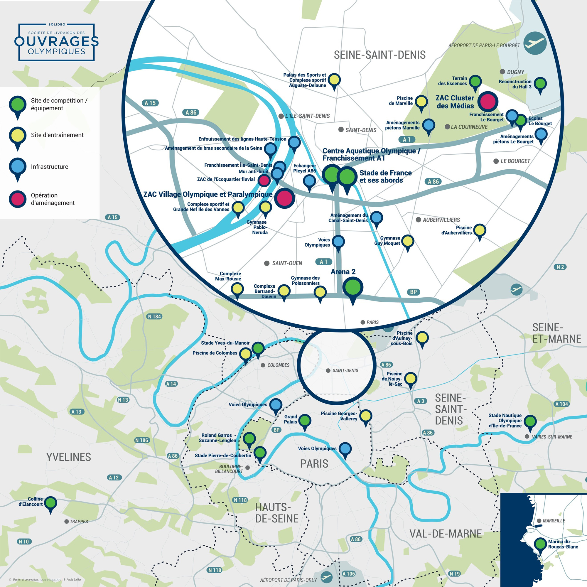 La compacité de la candidature de Paris tient au regroupement des sites olympiques dans deux zones principales : d’une part, celle de Paris centre, structurée autour de la Seine et intégrant des lieux emblématiques comme l’Arc de triomphe ou la tour Eiffel, ainsi que les infrastructures sportives de la proche banlieue Ouest (stades Pierre de Coubertin et Roland Garros) ; de l’autre, celle dite du Grand Paris, qui correspond en réalité, dans son immense majorité, aux sites olympiques situés en Seine-Saint-Denis, le long de l’axe de l’autoroute A1.