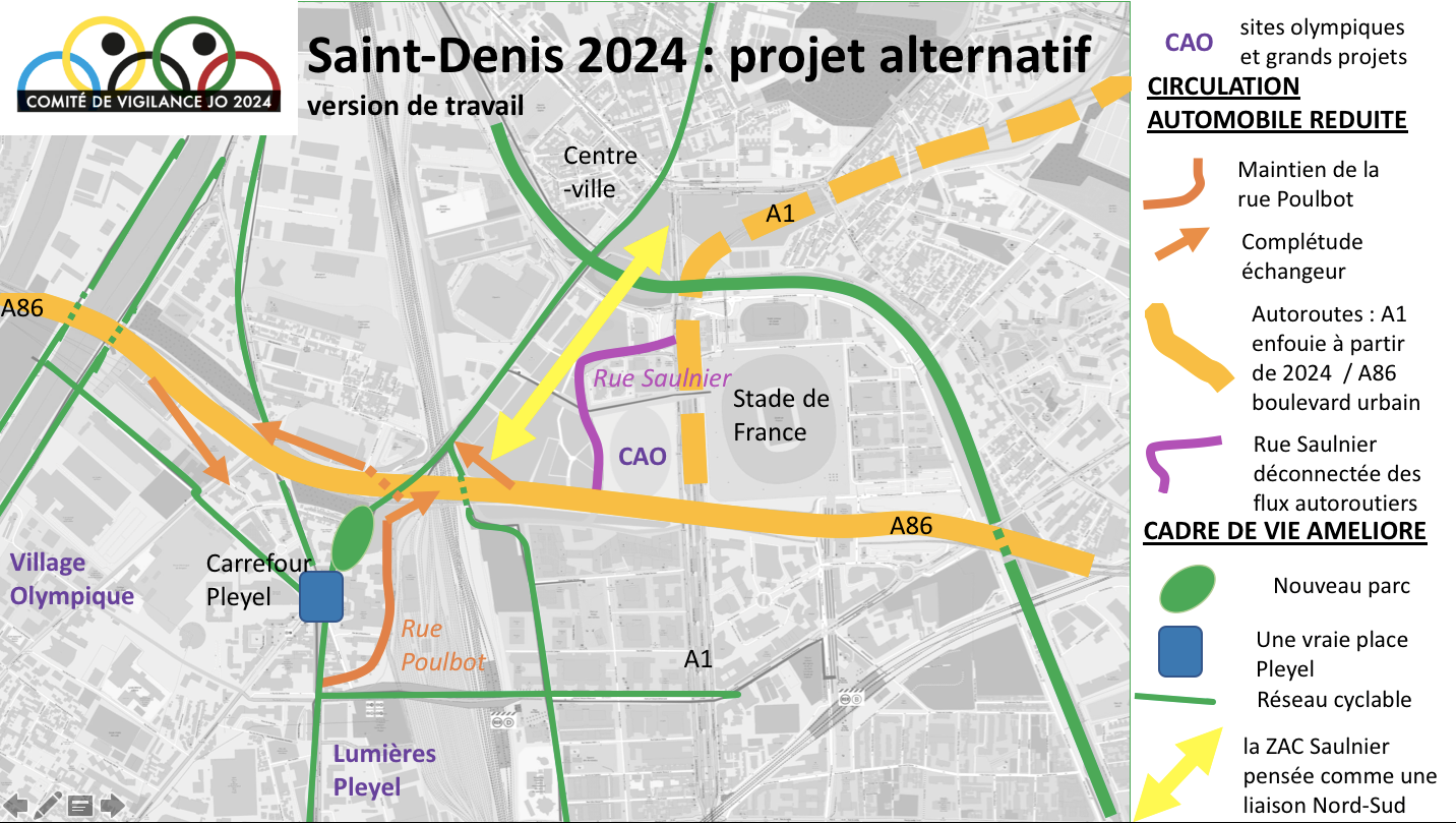 Face à ce manque de cohérence d’ensemble et aux conséquences indésirables des projets olympiques, des habitant·e·s se sont mobilisés au sein du Comité de vigilance des JO 2024 à Saint-Denis (dont les auteur·e·s de ce texte font partie), créé dans la foulée de l’attribution des Jeux olympiques à Paris en septembre 2017. Leur objectif est non seulement de collecter et de diffuser l’information à propos de l’organisation des JO sur le territoire, mais aussi de proposer un projet alternatif.