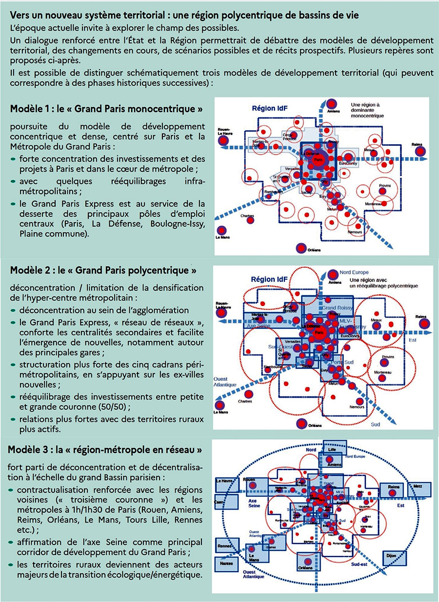 Cherchant manifestement une utilité au Grand Paris Express (GPE), le projet de nouvelles lignes de métro en périphérie, l’État entend en faire un élément structurant du polycentrisme francilien. Sa note d’enjeux présente trois modèles possibles exposés dans la figure 1.