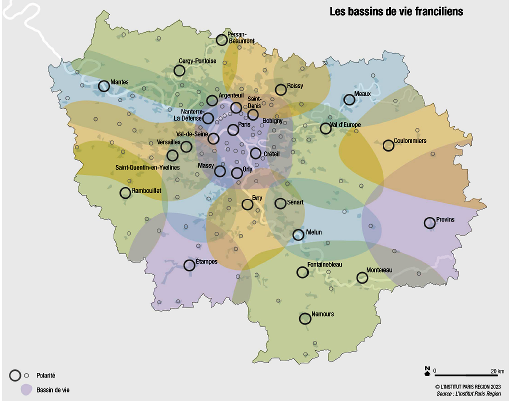 Le SDRIF-E introduit sa propre définition des bassins de vie : ils « constituent des espaces cohérents qui doivent permettre aux Franciliens d’accéder aisément à l’emploi, à une offre complète d’équipements, de commerces et de services, et à des espaces de nature. Les bassins de vie sont structurés par des polarités urbaines ». Constatons pourtant que la Région renonce à l’emploi sur place au bénéfice d’une offre de transport permettant l’accès à l’emploi hors du bassin de vie, contredisant l’espace « cohérent », affirmé en début de phrase. Dans le même temps, le projet d’aménagement régional revendique « pour chaque Francilien la possibilité de se loger, de travailler, de se cultiver, d’éduquer ses enfants, de se divertir, de s’aérer, de se promener et de trouver l’ensemble des biens et services dont il a besoin sur son lieu de vie ». Mais cet éventail dithyrambique des possibles est à mille lieues de l’état actuel (à l’exception de Paris et quelques grands pôles urbains). Il n’existe que sur le papier et n’a aucune chance de se concrétiser. En effet, les quinze périmètres de « bassin de vie » identifiés par la Région sont bien davantage des « territoires prescrits » de type institutionnel que des « territoires vécus » correspondant aux pratiques quotidiennes des habitants.
