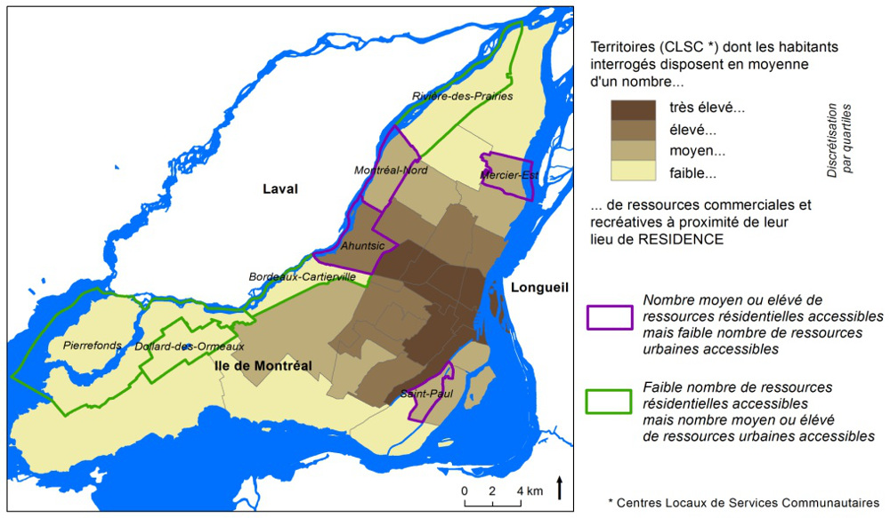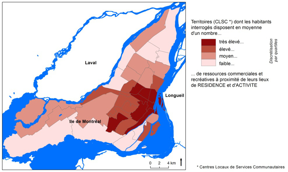 Alors que l’accessibilité aux services et aux activités est autant une question de personnes que de lieux, on constate que la majorité des études de santé publique ne considère comme ressources accessibles (qu’il s’agisse d’équipements de soins, commerciaux, sportifs, culturels ou de loisirs) que celles situées dans les quartiers de résidence des habitants interrogés. Restreindre l’analyse aux seules ressources résidentielles sans prendre en compte celles qui sont implantées dans les espaces quotidiennement visités par la population revient à nier la mobilité des individus, à réduire leur espace de vie à leur seul quartier de résidence et à tomber dans le piège d’une approche exclusivement locale ou résidentielle, que certains ont qualifiée de « local trap » (Cummins 2007) ou de « residential trap » (Chaix 2009). Afin de dépasser cette approche spatialement restrictive, il importe de prendre en compte la mobilité quotidienne des populations, qui conditionne l’accès aux ressources réparties dans l’ensemble de la ville (Inagami et al. 2007 ; Fol 2010 ; Vallée et al. 2010 ; Vallée et al. 2011) et de considérer comme potentiellement accessibles les ressources situées à proximité des lieux de résidence et d’activités des habitants.