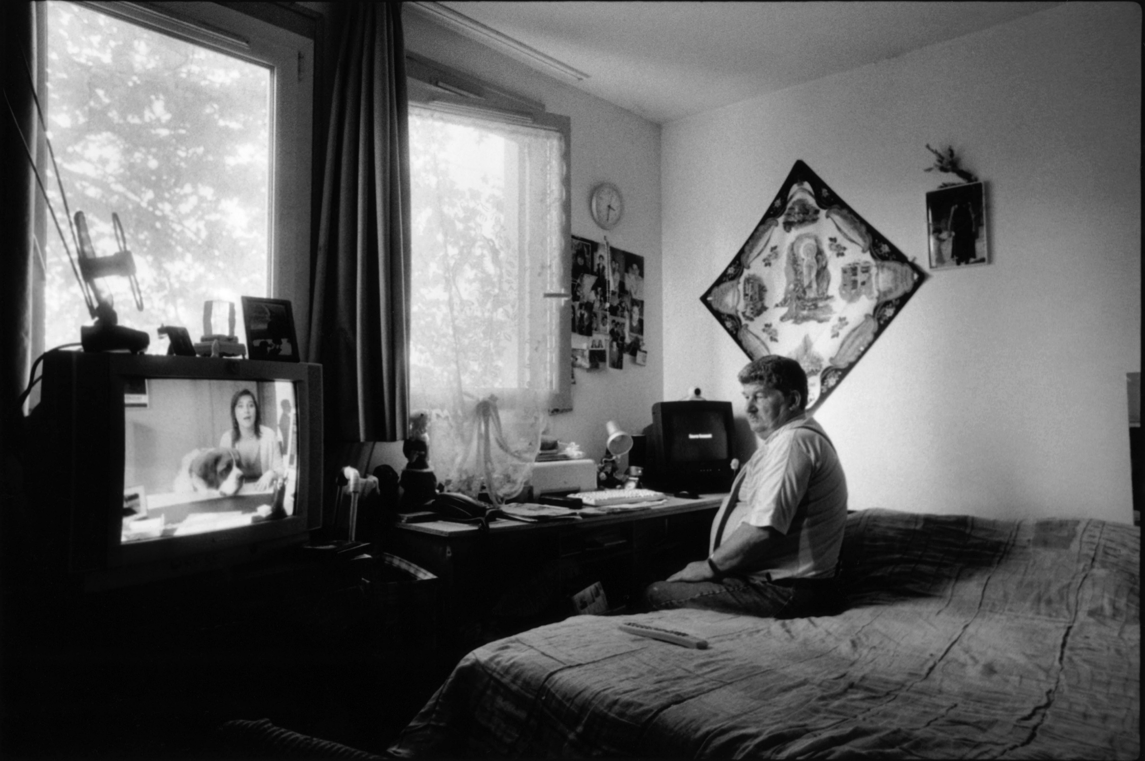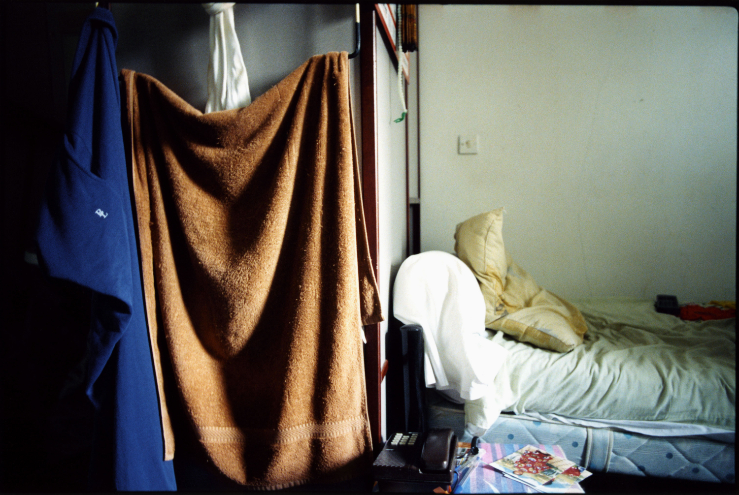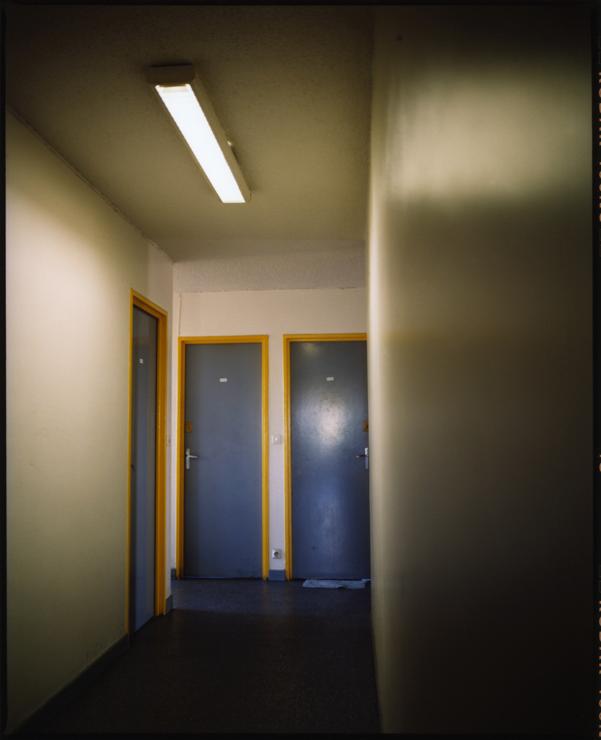 Chambre 520, cinquième étage, bâtiment A. La porte s’est ouverte. L’homme a souhaité la bienvenue. A prié le visiteur de s’asseoir. A fait les honneurs de la maison. A offert quelque chose à boire : thé, café, une bière peut-être. A engagé la conversation. Le temps qu’il fait dehors. Si on a eu du mal à trouver l’endroit. Est allé baisser le son de la télé. A montré la pièce d’un geste large, faites comme chez vous. Chambre 602, sixième étage, bâtiment A. L’homme âgé qui vit là est un des plus anciens du foyer. Remerciements et politesses d’usage s’échangent. Assis sur le bord de son lit il raconte son histoire. Encore quelques clichés sur le pas de la porte, une confidence, une promesse de se revoir peut-être, et le photographe prend congé. Appartement 028, bâtiment B : appartement ? C’est donc que le foyer a été rénové. L’homme montre ses mains aux doigts coupés, et les photos de son fils, punaisées sur le mur. D’autres chambres, d’autres visages, d’autres mains, d’autres objets, d’autres lignes de fuite par la fenêtre donnant sur les champs.