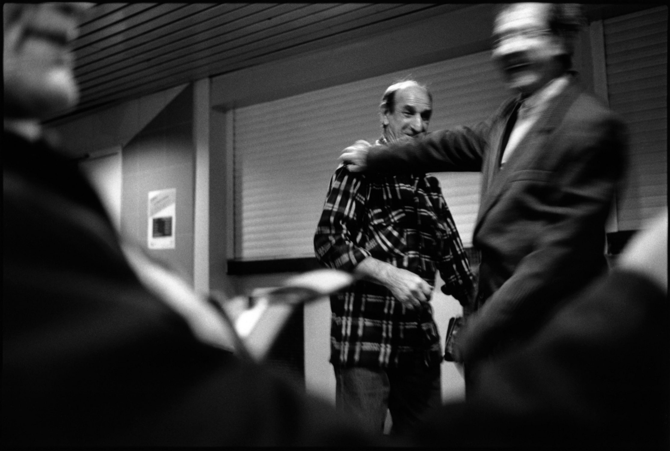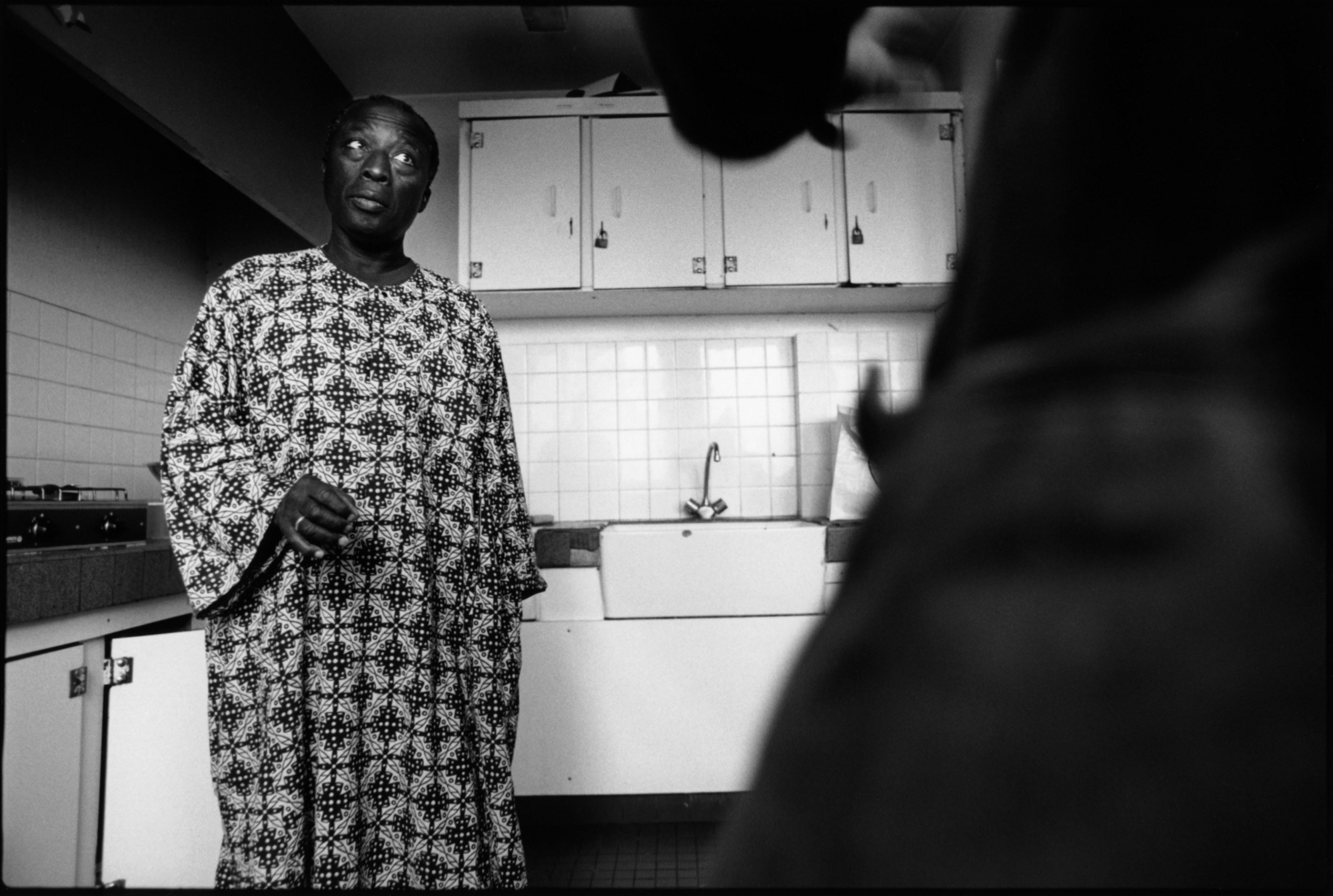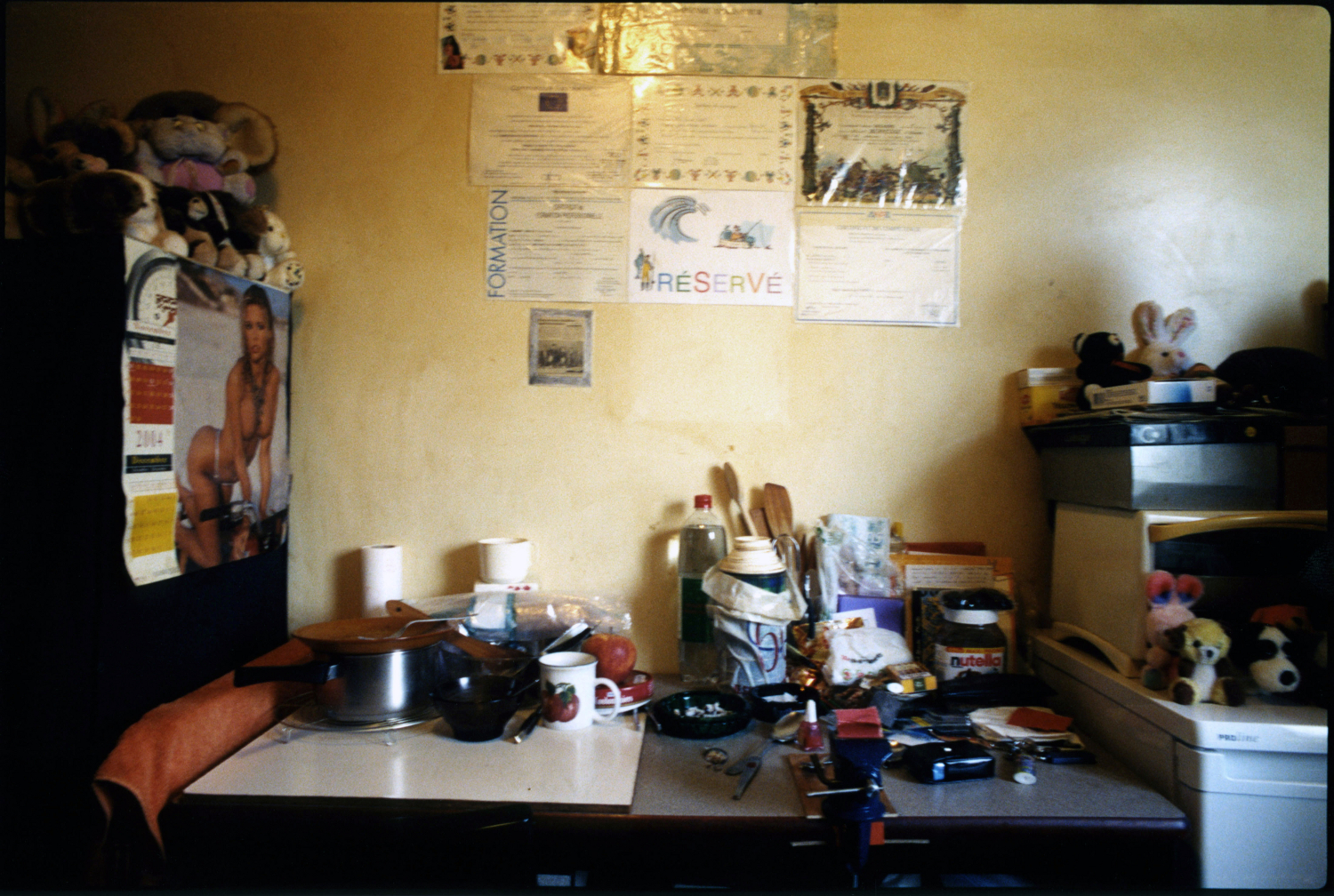 Chambre 520, cinquième étage, bâtiment A. La porte s’est ouverte. L’homme a souhaité la bienvenue. A prié le visiteur de s’asseoir. A fait les honneurs de la maison. A offert quelque chose à boire : thé, café, une bière peut-être. A engagé la conversation. Le temps qu’il fait dehors. Si on a eu du mal à trouver l’endroit. Est allé baisser le son de la télé. A montré la pièce d’un geste large, faites comme chez vous. Chambre 602, sixième étage, bâtiment A. L’homme âgé qui vit là est un des plus anciens du foyer. Remerciements et politesses d’usage s’échangent. Assis sur le bord de son lit il raconte son histoire. Encore quelques clichés sur le pas de la porte, une confidence, une promesse de se revoir peut-être, et le photographe prend congé. Appartement 028, bâtiment B : appartement ? C’est donc que le foyer a été rénové. L’homme montre ses mains aux doigts coupés, et les photos de son fils, punaisées sur le mur. D’autres chambres, d’autres visages, d’autres mains, d’autres objets, d’autres lignes de fuite par la fenêtre donnant sur les champs.