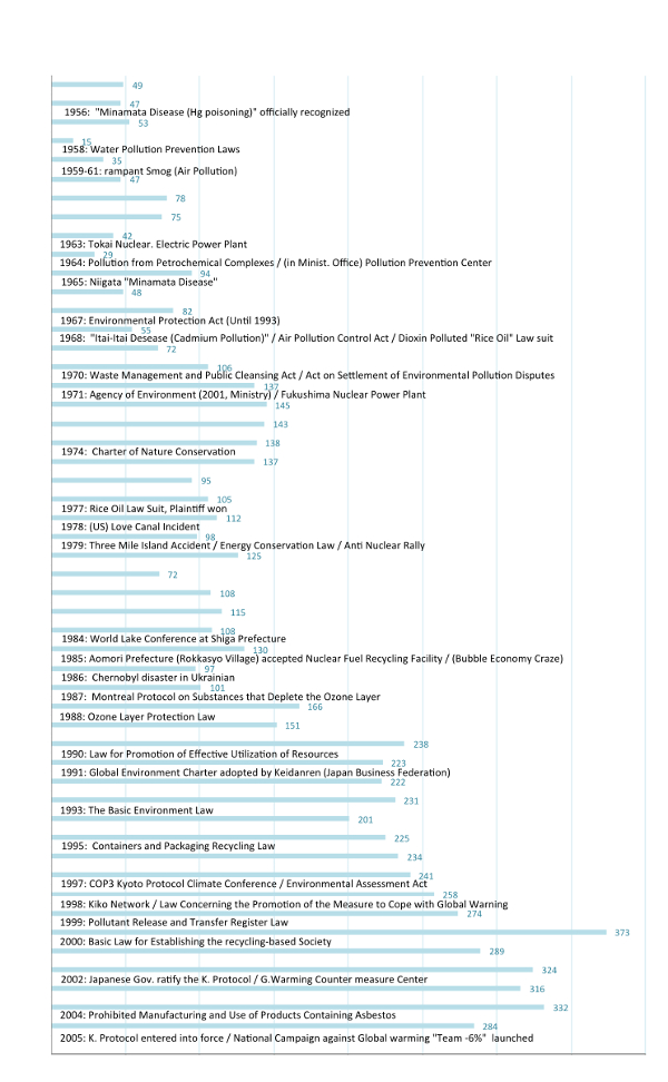 Rapid industrialization after World War II brought significant levels of pollution across Japan. Figure 3 presents major environmental events in Japan (and internationally) alongside an estimate of the number of new environmental organizations formed each year. Significant anti-pollution campaigns surged in the 1960s and early 1970s (Broadbent 1998; Funabashi 1992). Several potent examples of pollution and major public health problems drove the movement at this time, beginning with mercury poisoning in Minamata and extensive air pollution in Yokkaichi. These campaigns were successful in terms of favorable litigation for the victims but also in prompting the development of an incipient environmental regulatory apparatus in Japan. Various pollution control and regulatory acts passed through the Diet, culminating in the creation of the Environmental Agency (renamed Ministry of the Environment in 2001).