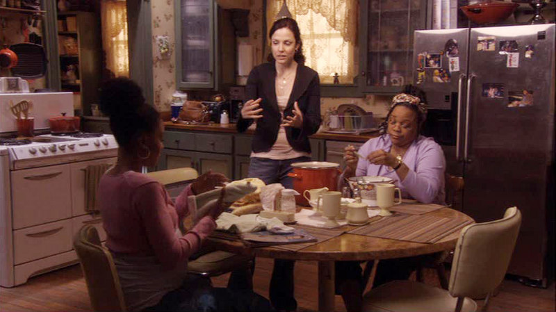 La spatialité de ces personnages donne à voir principalement deux mondes qui ne se recoupent pas : celui d’Agrestic et celui, que l’on ne fait que deviner, du downtown, entre lesquels seules Nancy et la femme de ménage semblent capables d’allers-retours (la rencontre des deux mondes d’ailleurs – quand la plantation sera basculée dans la maison de Celia, peu de temps avant l’incendie – mènera à la fin de leur histoire commune). Le premier monde exprime le white flight américain, la fuite des Blancs vers la banlieue, mais dont on voit bien qu’il ne peut vivre sans l’autre, le centre-ville noir aux maisons autrement habitées dans lesquelles tout tourne autour de la cuisine, d’un espace à tout faire (y compris accoucher comme pour la fille d’Heylia qui s’est fait renvoyer de l’hôpital). Alors que l’espace domestique d’Agrestic est montré dans ses différents cloisonnements usuels – la chambre des enfants, la salle de bain, une cuisine-bar équipée ouverte sur le salon avec baies vitrées et grands canapés comme seul lieu possible des croisements ou plutôt des juxtapositions (le Macintosh de l’un, la Game Boy de l’autre, la télé d’un troisième), éventuellement un atrium ouvert (« la pièce la plus conne jamais construite » sort Celia à son mari pour expliciter cette maison ridicule – une « super affaire » lui réplique son mari !) ; celui des Noirs américains renvoie, quant à lui, à des étagères chargées, des papiers peints colorés, des photos aimantées sur le frigo : un univers dépareillé mais nettement plus habité.
