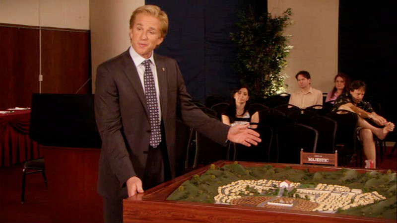 Lorsque la communauté d’Agrestic est mise en situation géographique, c’est en rapport avec Summer Canyon pour la vente d’un green ou avec Majestic, ville en plein essor limitrophe et qui a besoin de passer sur le territoire voisin pour le passage de ses réseaux d’assainissement. Doug, toujours influent, même lorsqu’il a perdu son poste de conseiller, dans un contexte où les caisses de la ville sont vides, s’exclame alors, « On les tient par le sphincter. […] Cette autoroute de la merde va nous mener à la richesse ». Il ne reste plus qu’à assister ensuite aux pots de vin versés par un agent trouble pour « faciliter » les négociations entre les deux conseils municipaux régis comme des clubs. On assiste bel et bien à une satire des États-Unis qui n’hésite pas à porter une critique sociale, avec les caractéristiques de la néo-série qui expriment à la fois la fin des certitudes morales, le réalisme pessimiste et plus généralement les tensions de la société américaine (Perreur 2011). Renvoyons ici, dans la version la plus explicite de la critique, à « ce criminel de Bush dans une guerre de pétrole à la con » qui, via la politique de lutte contre l’axe du mal, veut envoyer Andy sur le terrain irakien, lui qui avait signé pour l’armée de réserve lors d’un pari séducteur : « Se faire exploser par un gamin de 12 ans, fan de Friends, avant que nous défoncions sa maison – non merci ». Et Doug de répliquer, « Je t’aiderai, je mettrai un autocollant jaune sur ma caisse pour toi ». S’il est si pro-Bush, apprend-on, c’est qu’il aime sa femme à qui il achetait « de la bonne herbe à la fac ». Seule issue possible pour Andy, une stratégie de conversion au rabbinat !