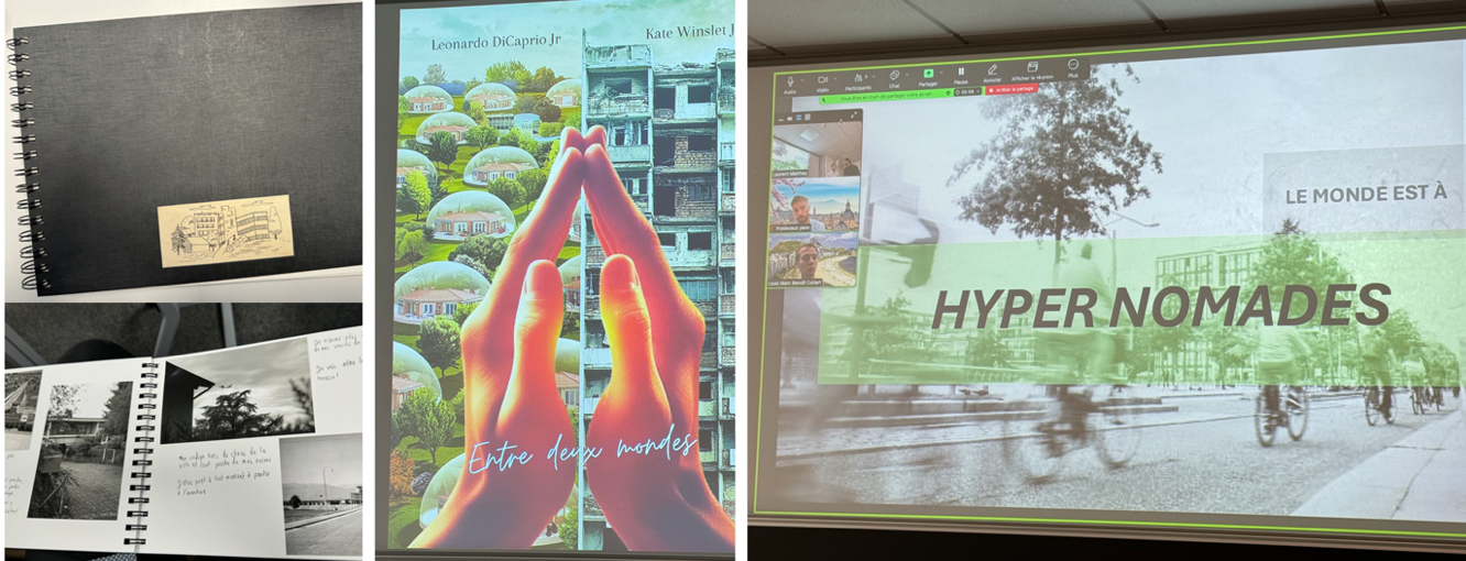 L’atelier entre, à partir de là, dans une phase qui est celle de l’exploration des possibles du monde anticipé par les différents groupes. Chacun testant ce qu’il adviendrait, en matière d’urbanisme, si (et nous citons ci-après quelques futurs envisagés lors des dernières éditions) : les autorités décidaient de rationner le nombre de mètres carrés réservés à chaque habitant·es (atelier 2021) ; les termes de l’urgence climatique décrétée par le Conseil d’État genevois étaient appliqués (2024) ; des aires urbaines étaient réservées à la déconnexion des habitants (2023)… Au terme de cet exercice, les participant·es restituent leurs visions de l’organisation territoriale en mobilisant une modalité de présentation dite créative (théâtre, film, jeu de simulation… – figure 2) au sens où elle s’écarte (sans les interdire – figure 3) des formats prescrits dans les autres ateliers du master (planches A0, rapport synthétique, supports PPT, présentation orale conforme aux attendus professionnels…).