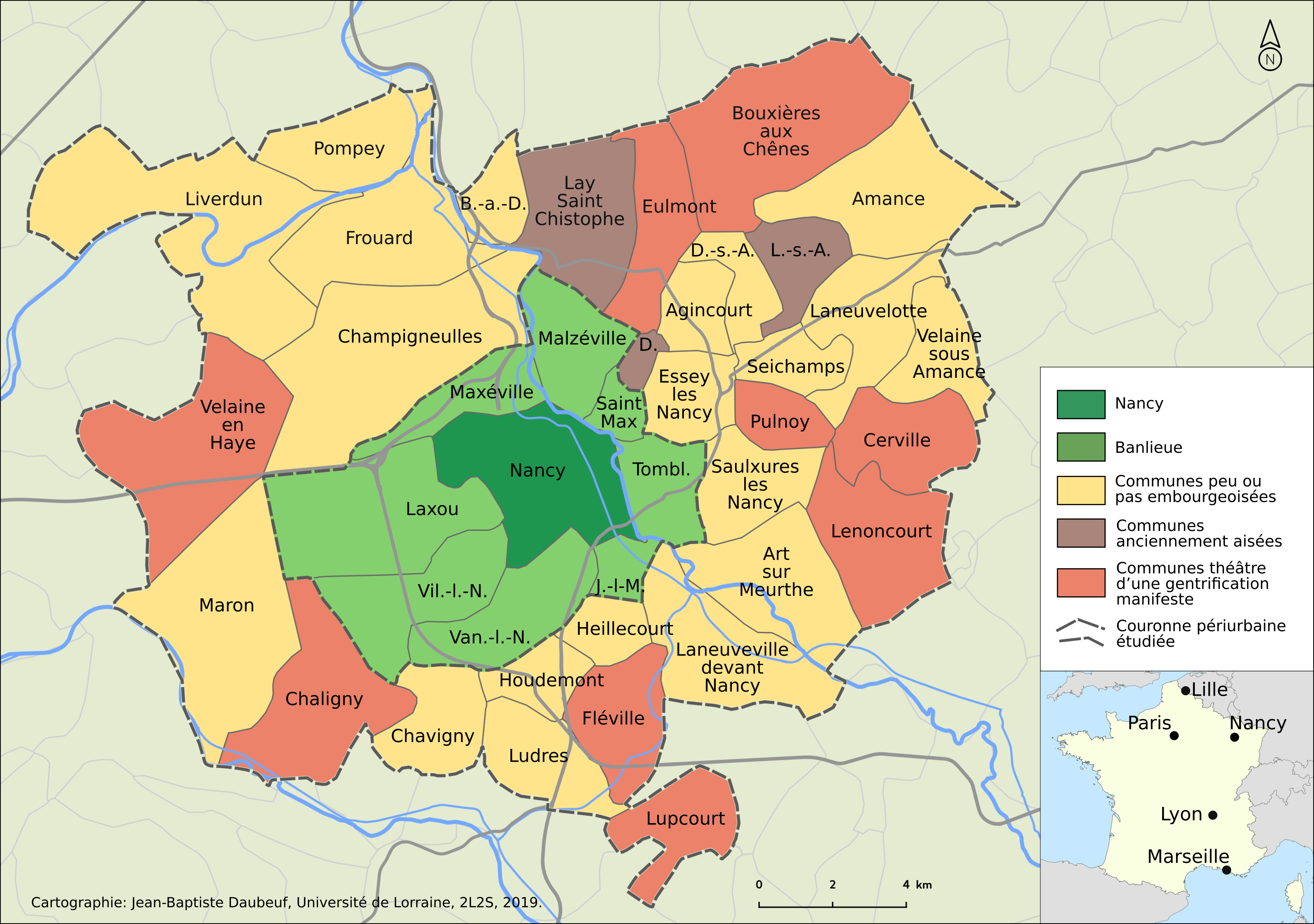 Depuis les années 1980, les travaux sur le périurbain ont surtout porté sur les logiques d’étalement urbain, les choix résidentiels, les enjeux environnementaux ou encore les mobilités quotidiennes. Force est de constater que la problématique de la gentrification en est absente (Marchal et Stébé 2018). Le concept de gentrification a été pendant longtemps mobilisé pour étudier l’installation des catégories sociales supérieures au sein des centres-villes populaires (Bidou-Zachariasen 2003 ; Hamnett 1991). Plus récemment, il a été appliqué à des communes des banlieues stricto sensu (Collet 2015), de sorte que les chercheurs en sciences sociales ont montré combien les processus de gentrification ont évolué au cours des quinze dernières années pour ne plus se limiter à la rénovation progressive des quartiers populaires dégradés des centres-villes par les nouvelles classes moyennes aisées (Lees et al. 2008 ; Rérat 2012). Le front de la gentrification semble avancer en effet en direction des banlieues, voire des espaces périurbains (Clerval 2013 ; Chabrol, Collet, Giroud et al. 2016). C’est à partir d’une recherche sur les première et deuxième couronnes périurbaines de Nancy que nous entendons montrer qu’un processus de gentrification du périurbain est à l’œuvre depuis une vingtaine d’années dans les espaces plus ou moins denses de cette agglomération.
