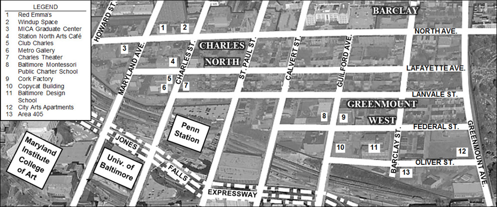 Baltimore’s Station North neighborhood was one of the first areas to receive an Arts & Entertainment (A&E) District designation from the state of Maryland in 2002. The program aims to “develop and promote community involvement, tourism and revitalization through tax-related incentives that attract artists, arts organizations and other creative enterprises” (Maryland State Arts Council 2015). In the geographic center of the city, near Penn Rail Station, this area consists of two neighborhoods, Charles North and Greenmount West. The area experienced severe decline beginning in the 1960s: white flight, property abandonment, and rampant crime. Beginning in the 1980s, however, artists and musicians claimed space here, and the past 10 years have seen gentrification ratchet up. Coffee houses, restaurants, bars, theaters, warehouse loft spaces, and galleries have opened, and new residences in former commercial and manufacturing spaces became available through changes to zoning laws and rehabilitation of existing structures. From 2000 to 2010, median household income increased from $18,089 to $33,906 (US Census Bureau 2015), and the number of white residents increased by 333% (whites still only represent 26.4% of the 1,751 residents, and blacks 68%).