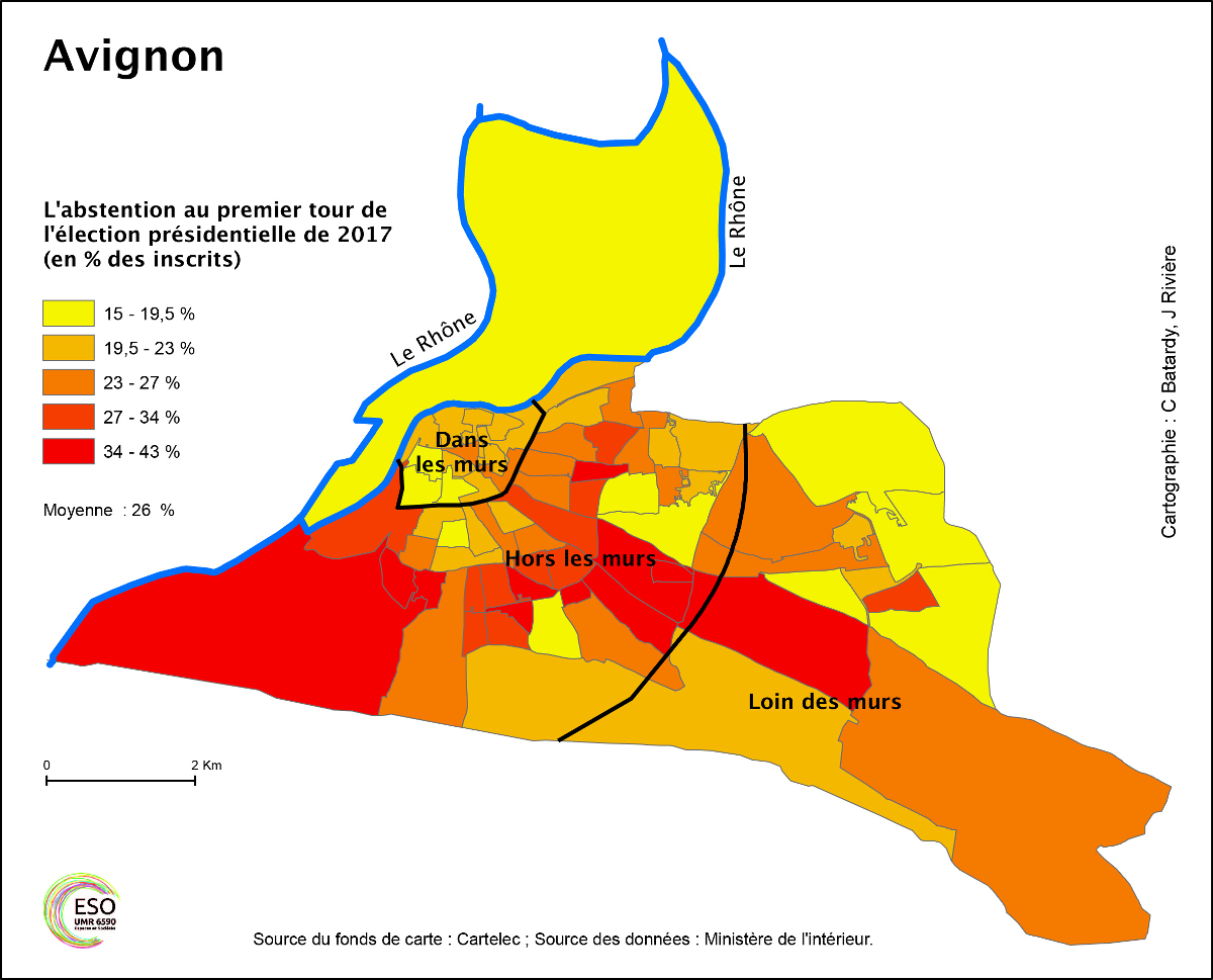 Avignon, la plus grande ville du Vaucluse, renommée pour son festival de théâtre international, son Palais des papes et son pont inscrits au patrimoine mondiale de l’UNESCO, est aussi la ville la plus pauvre de la région Provence-Alpes-Côte d’Azur, et une des plus inégalitaires. Au niveau politique, le département semble acquis au Front national, avec des scores en constante progression depuis une vingtaine d’années. Présent quasi systématiquement aux seconds tours des législatives, premier parti aux régionales et aux départementales de 2015, le FN est arrivé en tête dans la plupart des villes et villages du Vaucluse en totalisant 23,8 % des inscrits sur le département (soit 95 930 voix). Dans un tel contexte, le FN aurait pu se placer en tête à Avignon lors de cette élection présidentielle 2017, comme ailleurs en Vaucluse. La ville a pourtant fait exception dans le département le 23 avril 2017, puisque Jean-Luc Mélenchon s’est nettement imposé avec 20,5 % des inscrits contre 15,3 % au FN, au coude à coude avec Emmanuel Macron (15 %). Ce résultat doit se lire en comparaison avec celui du premier tour de la présidentielle 2012, à l’occasion duquel François Hollande avait distancé les autres candidats avec 23,4 % des inscrits (contre 17,8 % à Nicolas Sarkozy et 15,9 % à Marine Le Pen). Rappelons, d’ailleurs, que lors des élections municipales de 2014, Avignon a été une des rares villes reprises à la droite par une liste emmenée par la gauche socialiste [1]. En 2017, ici sans doute plus qu’ailleurs, la recomposition de l’électorat socialiste ne semble pas avoir profité à Emmanuel Macron, arrivé en troisième position.