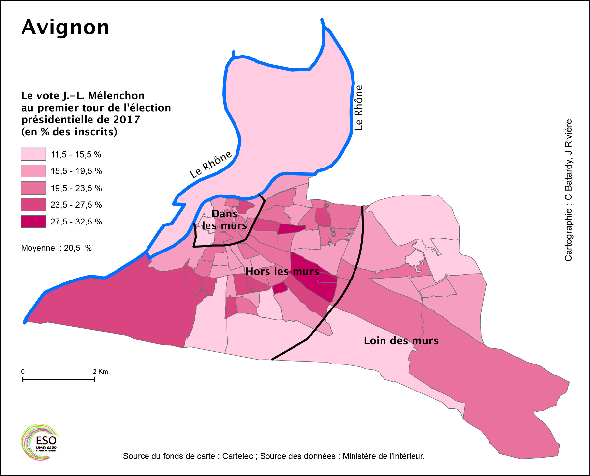 Avec un résultat de 20,5 % des inscrits à Avignon (28,3 % des exprimés), J.‑L. Mélenchon réalise un score supérieur de presque 6 points à sa moyenne nationale. Il n’obtient ainsi jamais moins de 11 % des inscrits et dépasse même les 30 % dans trois bureaux de vote « hors les murs », ceux des quartiers Saint-Chamand et Barbière (carte 2). Les bureaux qui lui sont les plus favorables sont ceux rassemblant les populations les moins favorisées socio-économiquement, et ce même dans les bureaux « dans les murs » (le nord-est de l’intra‑muros ou quartier des Italiens) ou « loin des murs » (Montfavet centre). Au-delà de cette géographie, on observe des corrélations fortes entre le vote pour le candidat de la France insoumise et les quartiers où l’on trouve le plus d’habitants sans diplôme (r = 0,56), résidant en HLM (0,58), et ouvriers (0,37), au chômage (0,66) et/ou occupant des emplois précaires (0,49).