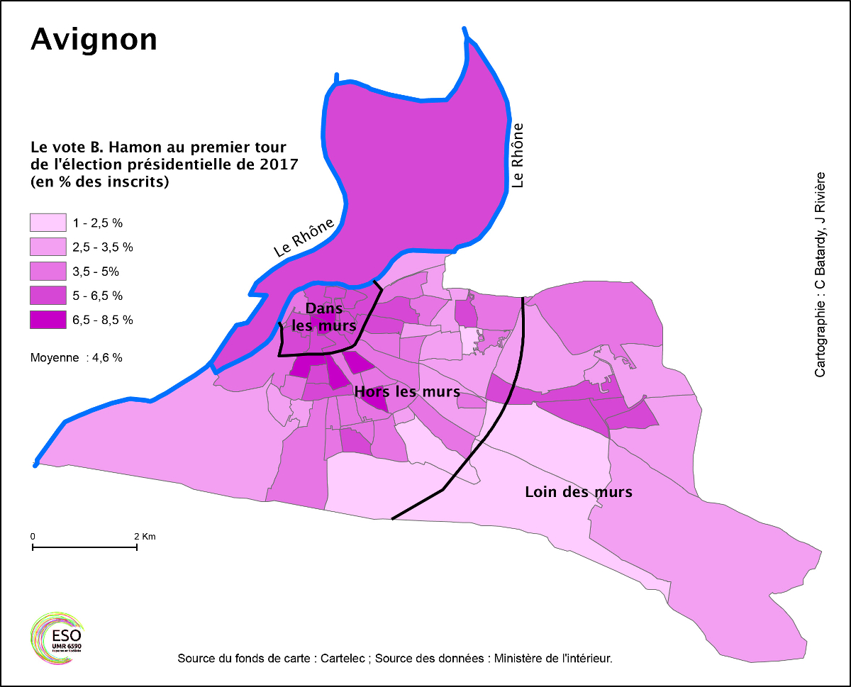 Bon dernier des « grands » candidats avec 4,6 % des inscrits à Avignon (carte 6), un résultat proche de sa moyenne nationale, Benoît Hamon réalise un score qui révèle l’effondrement d’un PS que la victoire socialiste aux municipales de 2014 parvient aujourd’hui difficilement à dissimuler. Les zones de résistance du PS, qui n’excèdent toutefois pas les 8,5 % des inscrits, se retrouvent dans deux bureaux de vote (autour de la place Pie et la zone piétonne) « dans les murs » où l’abstention est plus élevée que la moyenne nationale, et dans quatre bureaux qui bordent les remparts tout juste « hors les murs », composés des quartiers résidentiels du nord de l’avenue Monclar et de la rue de Provence. Il y conserve sans doute le noyau dur des écologistes, comme semble le suggérer la corrélation – somme toute assez peu élevée de 0,39 – avec le vote pour Eva Joly en 2012, la seule véritablement repérable. Le PS est, en revanche, en voie de disparition dans les quartiers populaires qui avaient pourtant donné ses meilleurs scores à François Hollande en 2012.