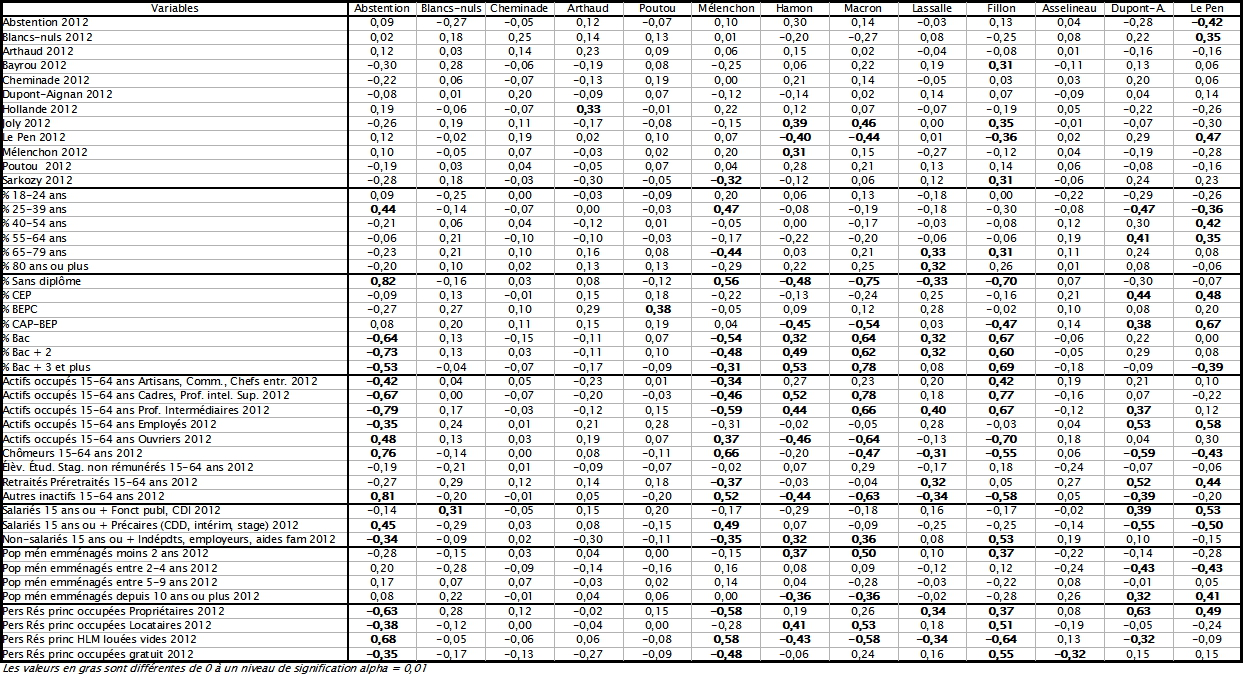 | Annexe 1. Quelques précisions méthodologiques Comme l’ensemble des articles de ce dossier thématique « Élection présidentielle : le vote des grandes villes françaises au microscope », les analyses proposées par les auteurs sont appuyées sur des cartes réalisées par Christophe Batardy (ingénieur d’études CNRS – UMR ESO) à l’échelle des bureaux de vote [8]. Les fonds de carte des bureaux de l’ensemble des villes au sommaire du dossier ont été produits grâce au travail d’actualisation de la base de données CARTELEC mené par Céline Colange (ingénieure de recherche CNRS – UMR IDEES). En complément de ces cartes, les auteurs ont pu mobiliser une matrice des corrélations statistiques (annexe 2) entre les comportements électoraux au premier tour du scrutin présidentiel de 2017, les votes observés au premier tour de la présidentielle de 2012 (de manière à pouvoir resituer politiquement les résultats), et quelques variables socioéconomiques diffusées par l’INSEE (de manière à pouvoir éclairer sociologiquement les résultats). Le problème d’inadéquation entre ces trois fonds de carte (découpage des bureaux en 2017, tracé des bureaux en 2012, périmètre des IRIS de l’INSEE en 2014) a été résolu par la ventilation de l’ensemble des données dans la maille spatiale des bureaux millésimés 2017, en s’inspirant de travaux développés dans le cadre de l’ANR CARTELEC (Beauguitte et Colange 2013) [9]. La production des matériaux cartographiques et statistiques a été coordonnée par Jean Rivière. Annexe 2. Matrice des corrélations |