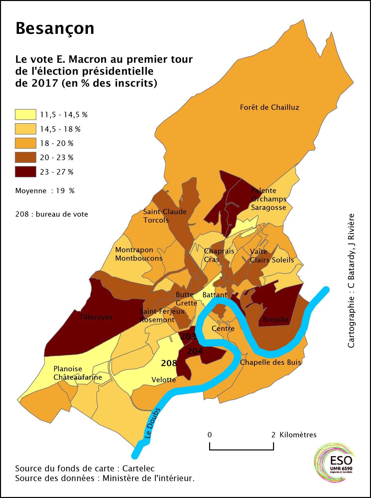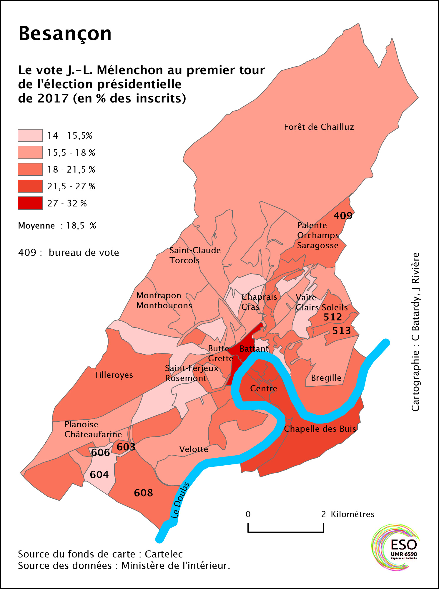 En opposition avec les figures locales du PS ralliées au candidat Macron, Barbara Romagnan, députée socialiste de la première circonscription du Doubs, très présente dans la ville et bien implantée dans les réseaux militants et associatifs, est une des figures de proue de la fronde parlementaire socialiste contre le gouvernement. Elle fait partie des six élues qui ne votent pas la mise en place de l’État d’urgence en décembre 2015 et s’abstient lors du vote de la confiance au gouvernement Cazeneuve en décembre 2016. B. Romagnan a mené une campagne active en faveur de la candidature de Benoît Hamon lors des primaires, puis durant la campagne de l’élection présidentielle. Ajoutons à ce panorama un élément plus anecdotique : l’enracinement bisontin de Jean-Luc Mélenchon (qui a fait ses études dans la capitale de la Franche-Comté) invite à prêter attention aux suffrages obtenus par ce dernier dans la ville. Ce contexte politique trouve un écho dans les résultats du premier tour des élections présidentielles de 2017, que cet article se propose d’analyser à l’échelle fine des bureaux de vote de la ville (annexe 1).