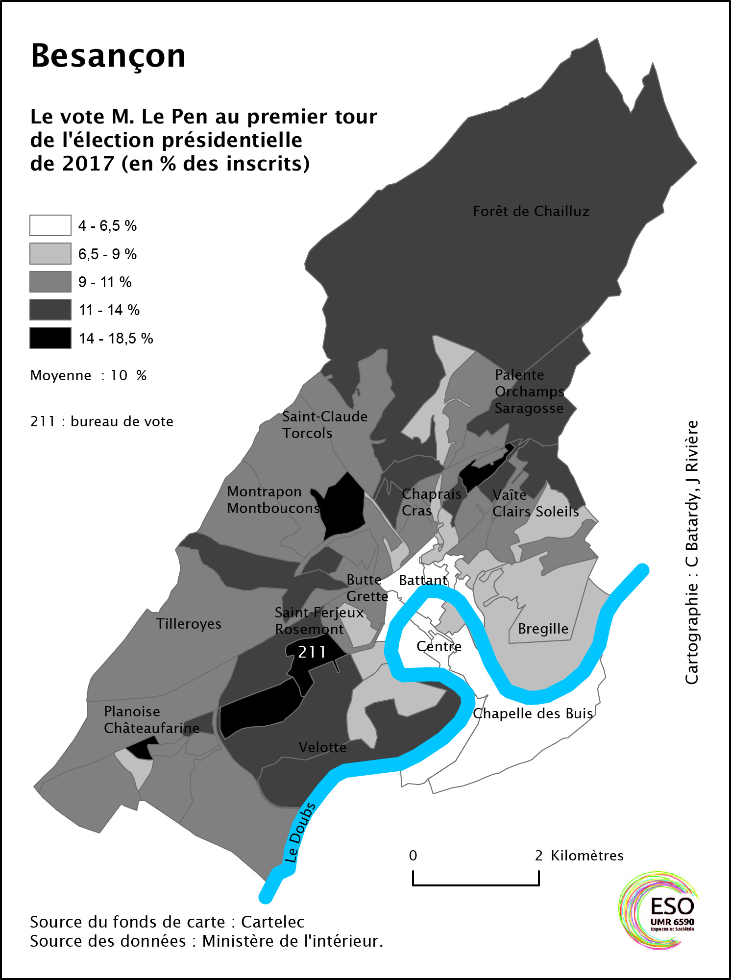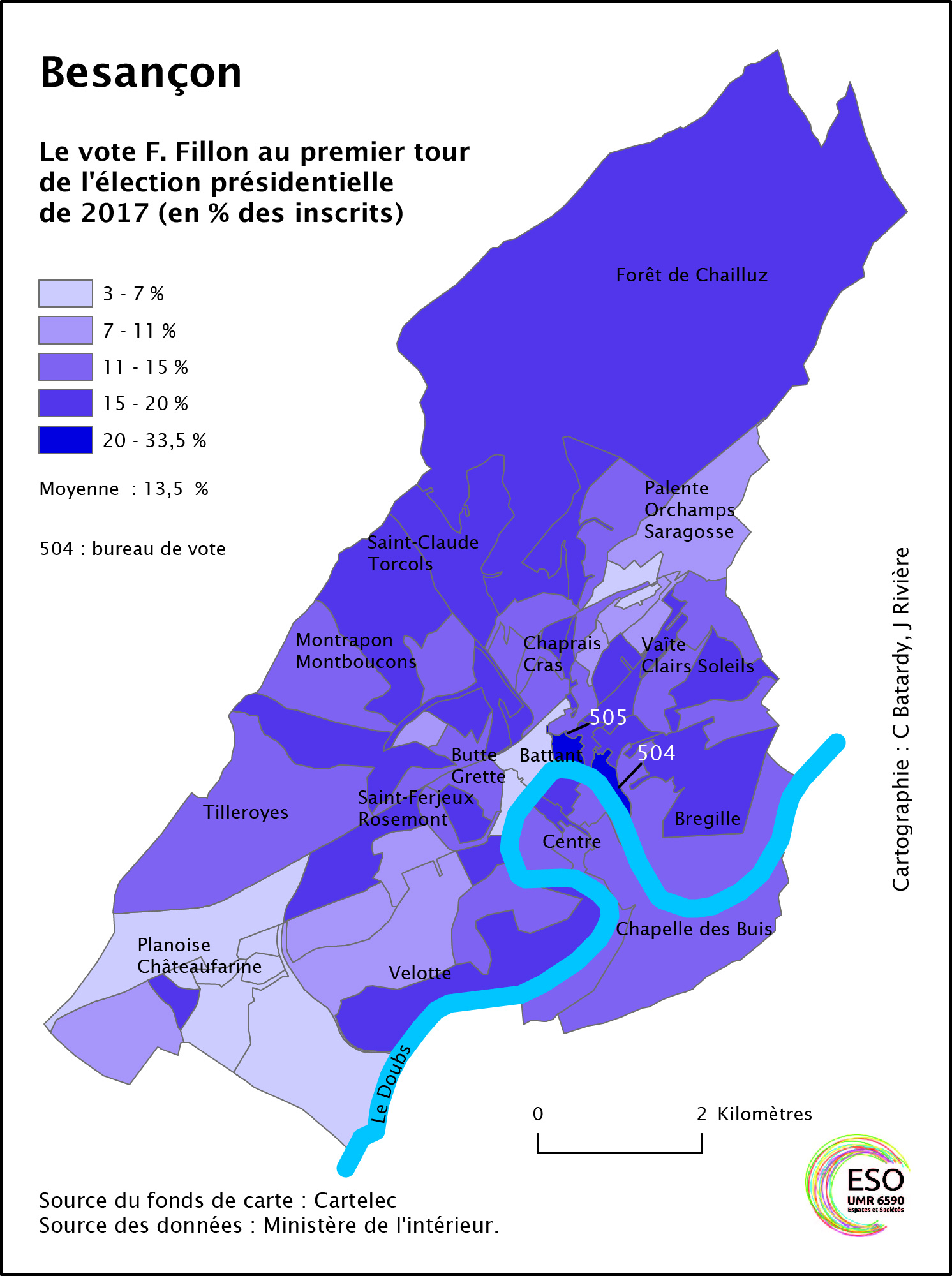 Cette géographie du vote FN, qui recoupe en partie les zones de force du vote Mélenchon (notamment à Planoise, Palente, Rosemont), présente, d’autre part, un contraste saisissant avec le vote en faveur de François Fillon. En effet, le candidat Les Républicains enregistre ses meilleurs scores dans les quartiers les plus aisés de la ville (Mouillères, Helvétie et le nord du quartier Chaprais–Cras, Velotte, Bregille, Rue de Vesoul ou Torcols dans le quartier Saint-Claude), zones où le FN enregistre ses plus mauvais résultats. Les enracinements électoraux de Fillon et de Le Pen apparaissent ainsi fortement contrastés : par exemple, dans le bureau de vote n° 505, situé dans le quartier aisé au sud de Chaprais–Cras, l’enracinement fort du vote en faveur de François Fillon (33,3 % des électeurs inscrits) s’accompagne d’un vote de seulement 3,7 % en faveur de Marine Le Pen [12]. De manière générale, l’enracinement du vote Fillon est essentiellement faible au sud de la ville (Planoise, Chateaufarine), au centre-ville et surtout dans le quartier Battant.