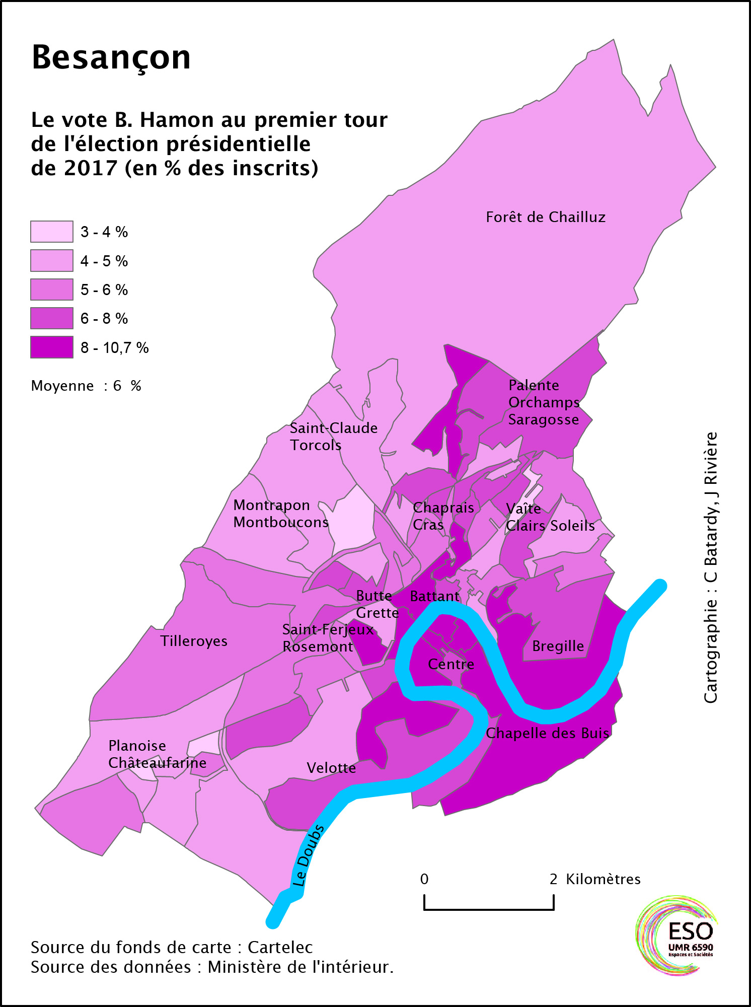 À Besançon, le scénario des « deux gauches irréconciliables » semble donc se réaliser : E. Macron et J.‑L. Mélenchon s’arrogent des parts égales de l’électorat, aux contours sociologiques toutefois différents, tandis que les partis de droite, distanciés, conservent des assises beaucoup plus faibles et spécialisées dans les populations aisées (pour LR) ou plus précarisées (pour le FN). Cet affrontement aura donc fait un dommage collatéral : la disparition quasi totale du PS, saisissante au vu de l’ancrage historique du vote en faveur de ce parti à Besançon, tant municipal que national, et de la présence d’une députée proche du candidat Hamon sur le territoire. Avec 4 326 voix, le candidat investi par le PS et soutenu par Europe Écologie–Les Verts obtient le même score, à quelques voix près, que François Bayrou en 2012, et se trouve totalement disqualifié, loin derrière le duo de tête, avec 2 000 voix de retard sur le FN.