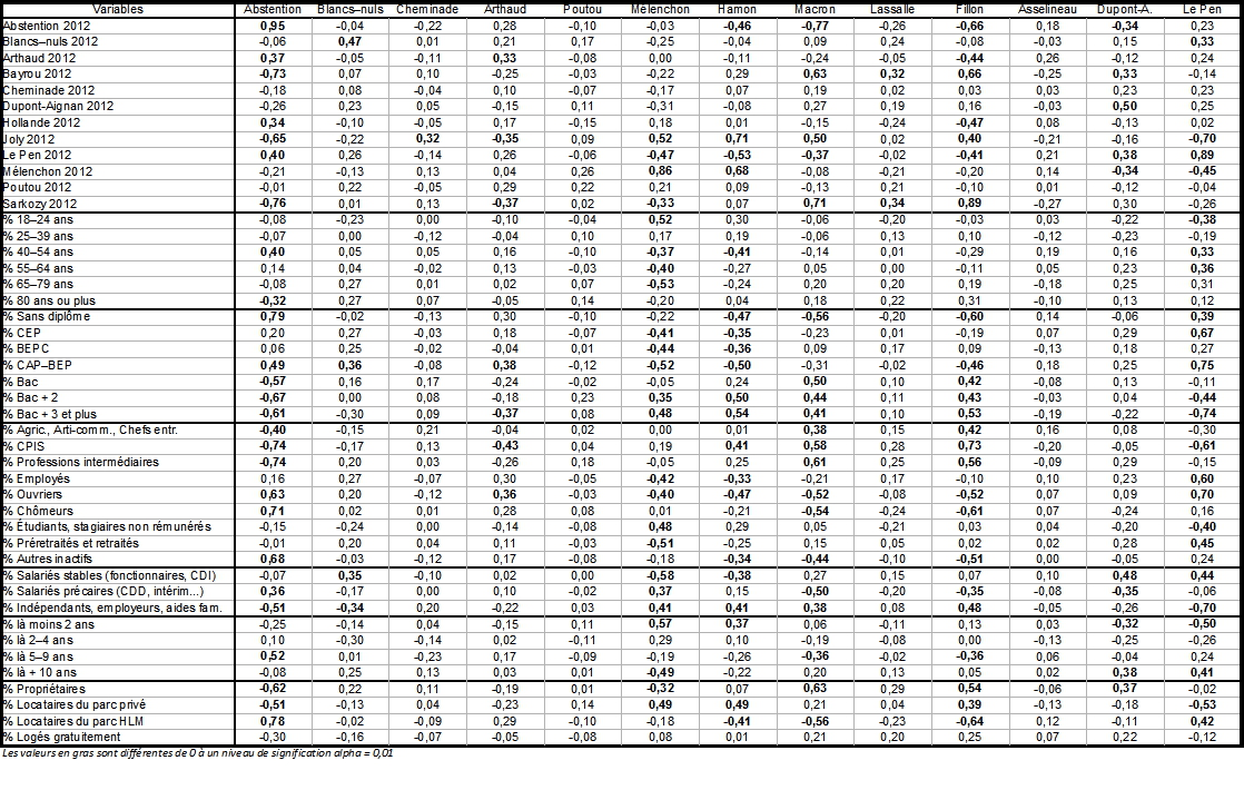 | Annexe 1. Quelques précisions méthodologiques Comme l’ensemble des articles de ce dossier thématique « Élection présidentielle : le vote des grandes villes françaises au microscope », les analyses proposées par les auteurs sont appuyées sur des cartes réalisées par Christophe Batardy (ingénieur d’études CNRS – UMR ESO) à l’échelle des bureaux de vote [14]. Les fonds de carte des bureaux de l’ensemble des villes au sommaire du dossier ont été produits grâce au travail d’actualisation de la base de données CARTELEC mené par Céline Colange (ingénieure de recherche CNRS – UMR IDEES). En complément de ces cartes, les auteurs ont pu mobiliser une matrice des corrélations statistiques (annexe 2) entre les comportements électoraux au premier tour du scrutin présidentiel de 2017, les votes observés au premier tour de la présidentielle de 2012 (de manière à pouvoir resituer politiquement les résultats), et quelques variables socioéconomiques diffusées par l’INSEE (de manière à pouvoir éclairer sociologiquement les résultats). Le problème d’inadéquation entre ces trois fonds de carte (découpage des bureaux en 2017, tracé des bureaux en 2012, périmètre des IRIS de l’INSEE en 2014) a été résolu par la ventilation de l’ensemble des données dans la maille spatiale des bureaux millésimés 2017, en s’inspirant de travaux développés dans le cadre de l’ANR CARTELEC (Beauguitte et Colange 2013) [15]. La production des matériaux cartographiques et statistiques a été coordonnée par Jean Rivière. Annexe 2. Matrice des corrélations |