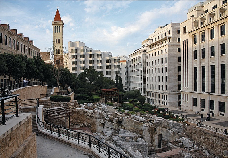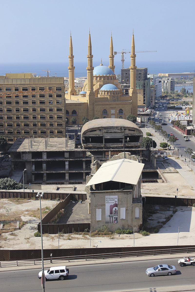 Au premier plan, le ring (avenue Fouad-Chahab) puis la chapelle Mar Mansour, la salle de cinéma surnommée The Egg, vestige du City Center Complex, jamais achevé depuis 1975, l’immeuble al-Azarieh rénové et la mosquée Muhammad al-Amin, récemment construite. Photo : Sophie Brones.