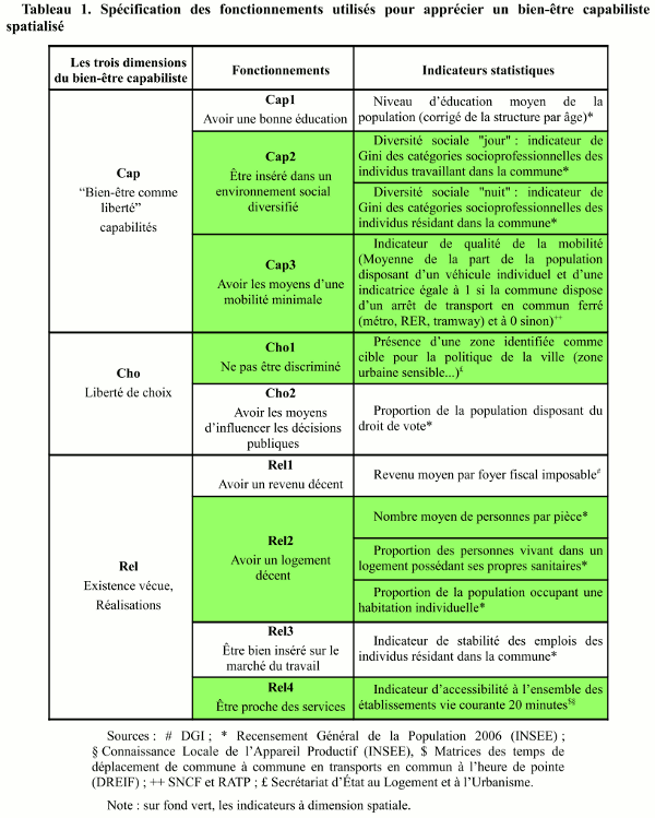 La mesure concrète du bien-être avec cette approche reste forcément partielle au regard de la richesse de sa définition théorique (pour une discussion de ces difficultés méthodologiques, voir Robeyns 2000 ; Alkire 2008 ; Chiappero-Martinetti 2006 ; Comim 2001). Dans le cas francilien, la question de la disponibilité des données géolocalisées dans les 1 300 communes et les arrondissements parisiens [2] contraint encore plus le choix des indicateurs et l’échelle de la mesure.