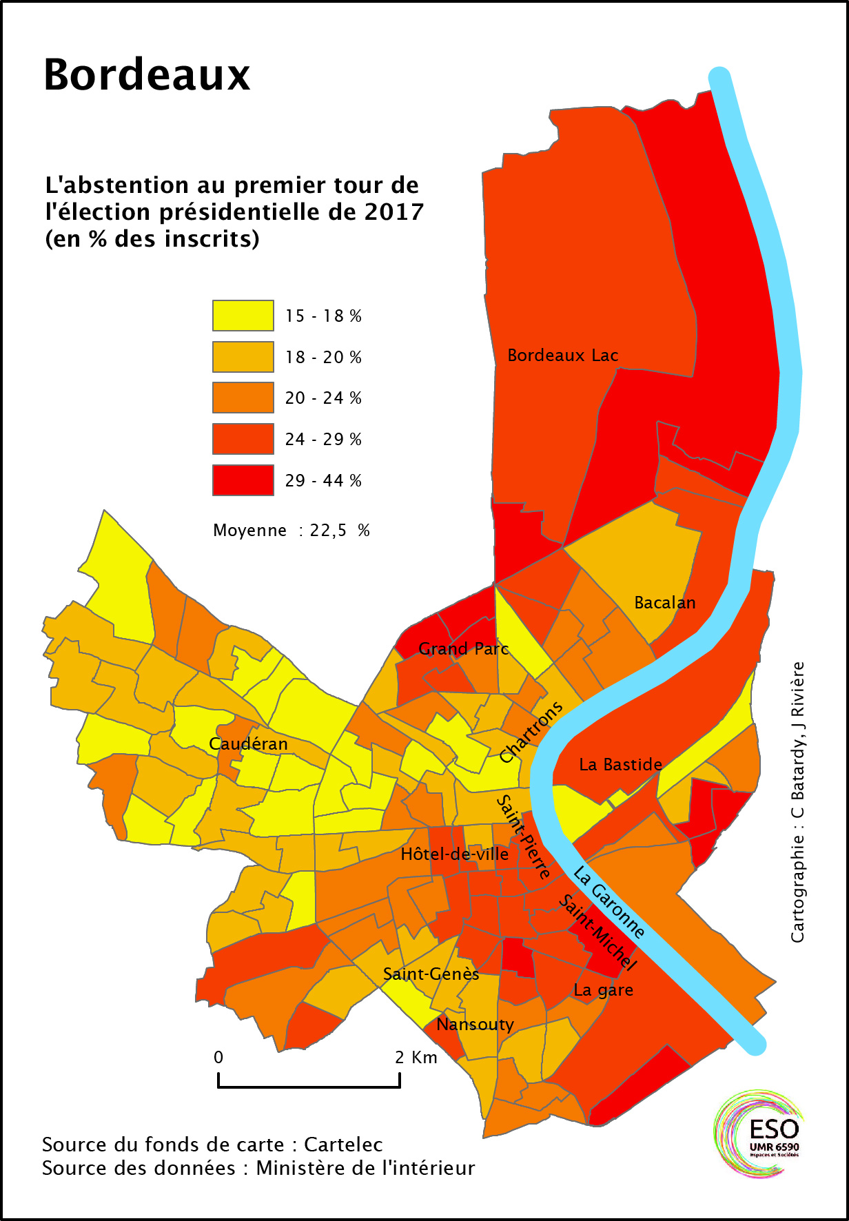 L’abstention à l’échelle de la ville de Bordeaux au premier tour apparaît comparable à la moyenne nationale (22,4 % contre 22,2 %) mais supérieure à la moyenne départementale (19,5 %). Ce scrutin confirme dès lors le constat d’une surabstention urbaine, notamment du fait de phénomènes de mal-inscription sur les listes électorales touchant prioritairement une population plus mobile, déjà mise en évidence ailleurs (Braconnier et Dormagen 2007).