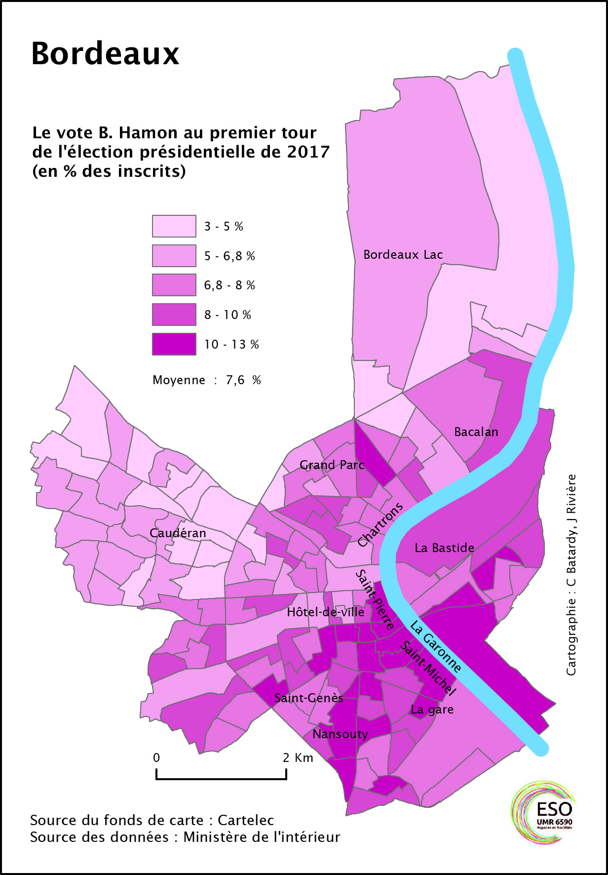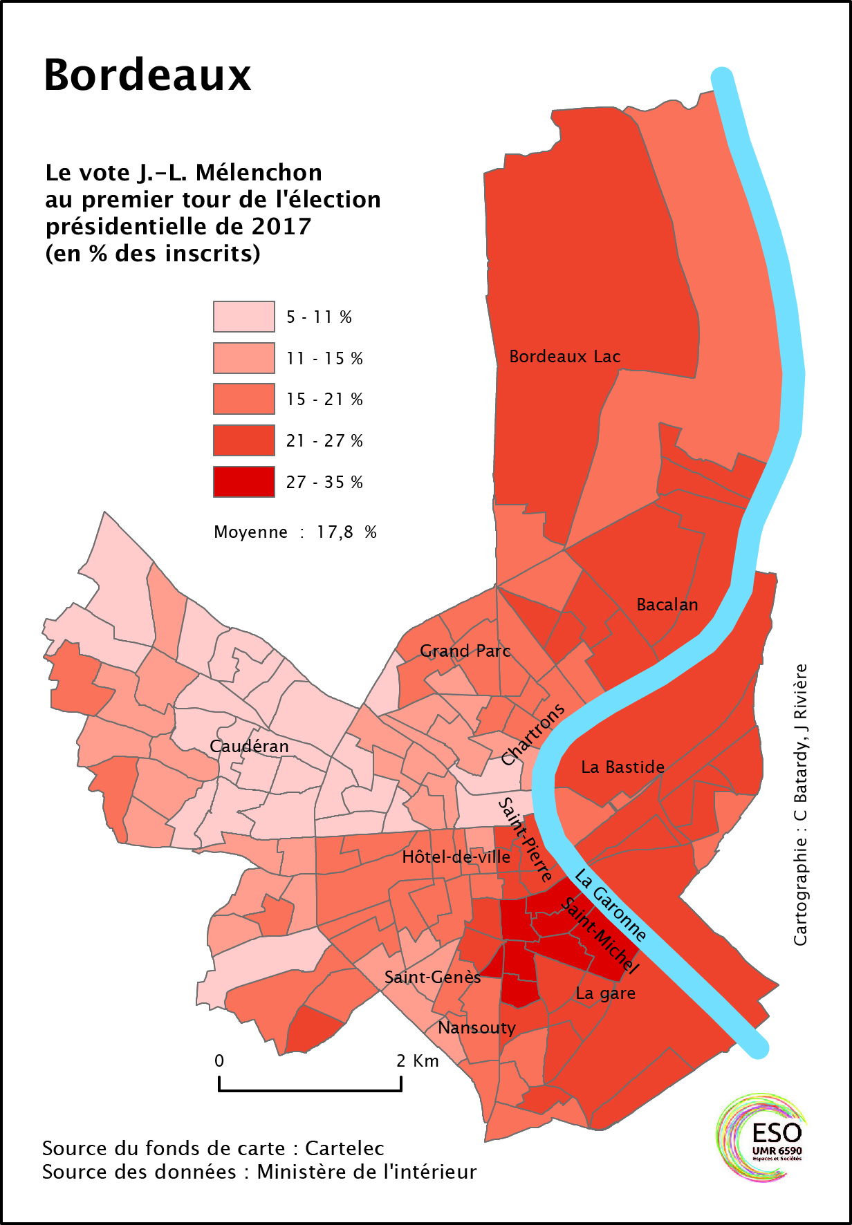 Les scores des deux principaux candidats de la gauche, Benoît Hamon et Jean-Luc Mélenchon, sont à Bordeaux supérieurs à ceux qu’ils ont réalisé à l’échelle nationale. Au premier tour, J.‑L. Mélenchon rassemble 23,4 % des suffrages exprimés (17,9 % des inscrits), se plaçant en seconde position derrière E. Macron et dépassant de presque 4 points son score national (19,6 %). Benoît Hamon réalise également un score supérieur à sa performance nationale. Avec 10,1 % des suffrages exprimés (7,7 % des inscrits), il devance Marine Le Pen au premier tour (7,4 %, soit 5,6 % des inscrits). Ces deux phénomènes ancrent Bordeaux dans le club de ce que Fabien Escalona a appelé les « idéopôles », ces territoires urbains « concentrant les activités et les groupes sociaux typiques de l’économie postindustrielle et de la mondialisation » (Escalona et Vieira 2012, p. 2). Dans ces territoires, des caractéristiques socio-économiques (surreprésentation des diplômés, des étudiants, concentration des fonctions et emplois métropolitains, des activités et équipements culturels, etc.) sont corrélés à des comportements électoraux de plus en plus spécifiques et distincts d’autres types de territoires. Parmi ces traits, que confirment la présidentielle de 2017 (Escalona 2017), on retrouve une forte allergie au vote frontiste mais aussi une surreprésentation du vote de gauche et la montée en puissance d’un vote de centre-droit procédant davantage de cadres dirigeants et d’entrepreneurs que d’une bourgeoisie traditionnaliste et rentière.