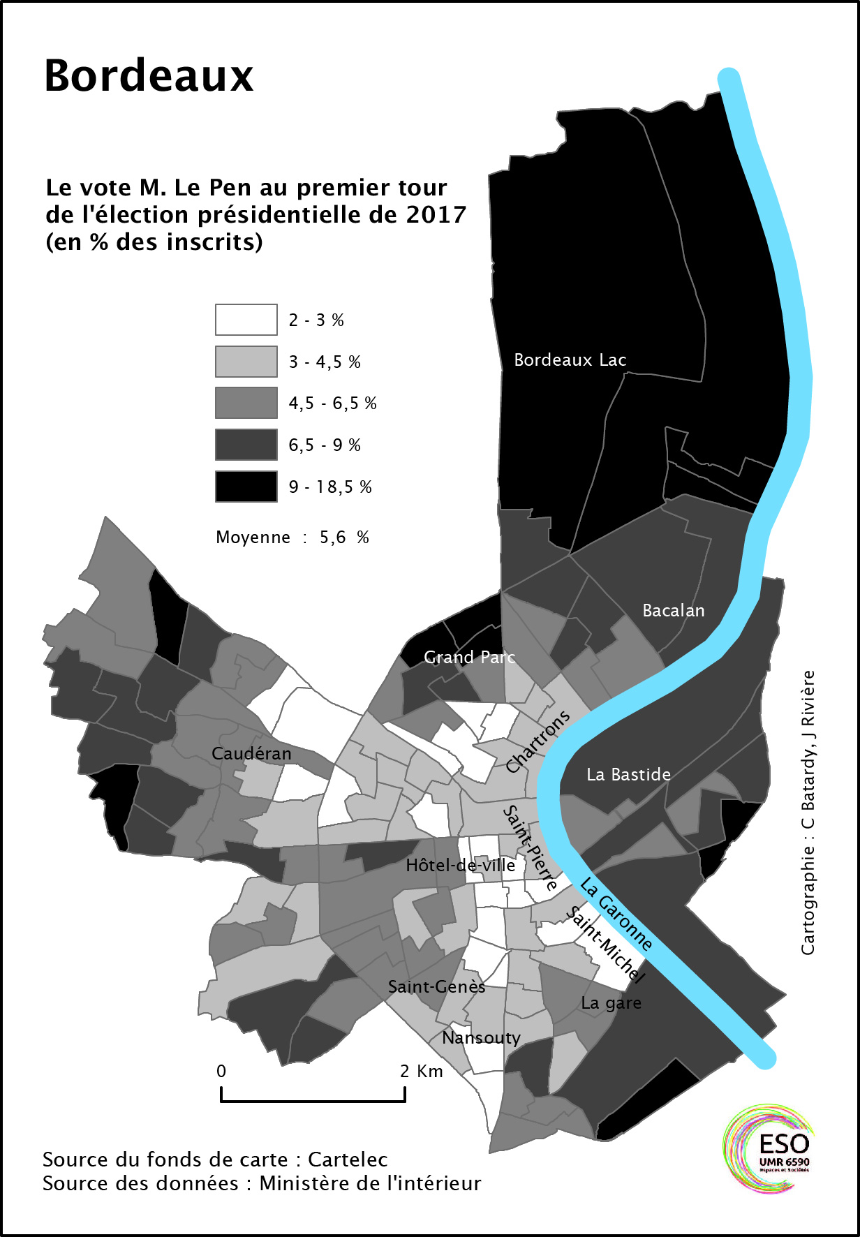Ce fond idéologique modéré, associé au caractère très divers de la structure sociale de la ville, a entraîné des traductions électorales frappantes. En effet, depuis 2007, Bordeaux a toujours placé le candidat de gauche en tête des premiers et seconds tours des présidentielles [10]. La même chose vaut pour les élections régionales. Par ailleurs, François Bayrou a depuis 2002 toujours fait à Bordeaux des scores supérieurs à ceux réalisés au niveau national. Enfin, ce modérantisme a condamné, comme nous l’avons déjà souligné, le Front national à des scores quasi anecdotiques à Bordeaux. En 2017, après avoir obtenu 7,4 % des suffrages exprimés au premier tour (5,6 % des inscrits), Marine Le Pen a atteint 14,1 % au second (9,3 % des inscrits, 13 773 voix), ne faisant que très modestement progresser le score de 11,8 % des exprimés (8,9 % des inscrits, 10 260 voix) réalisé par son père en 2002 au second tour. Les quartiers où la candidate de l’extrême droite obtient ses scores les plus élevés sont ceux où l’abstention atteint ses niveaux les plus hauts (r = 0,45). Il s’agit des quartiers où se concentrent les locataires du parc HLM (r = 0,67). Ici, peut-être faut-il relever une spécificité bordelaise : les grands ensembles localisés dans la ville-centre accueillent toujours une forte proportion de personnes âgées « autochtones » ou issues des immigrations européennes (espagnole et portugaise notamment) qui cohabitent avec des populations issues d’une immigration plus récente extra-européenne. C’est notamment le cas du Grand Parc, des Aubiers, mais également du quartier de la Benauge sur la rive droite. Il faut néanmoins nuancer : les bureaux de votes bordelais sensibles au discours frontiste sont également ceux qui présentent une part d’ouvriers, d’employés, et de salariés stables plus importante (corrélations respectives de 0,75, 0,76, 0,66). C’est ce que l’on constate pour des quartiers comme Bordeaux-Lac, Bacalan et la Bastide, et l’on peut imaginer que le vote FN (carte 4) est ici le fait de résidents des nombreuses zones pavillonnaires sises au voisinage des grands ensembles. Ceci confirme ce qui a été démontré par ailleurs, à savoir que les populations les plus précarisées ne sont pas celles qui votent le plus volontiers pour le Front national. Les groupes les plus enclins à voter FN sont ceux qui se situent juste au-dessus sur l’échelle sociale : la population des « petits-moyens » qui entretiennent le sentiment d’être lésés vis-à-vis des groupes qui se situent immédiatement en dessous dans la hiérarchie sociale (Cartier et al. 2008 ; Schwartz 2009) et se sentent exposés à la menace du déclassement et de la précarité (Pelletier et Mauger 2016 ; Mayer 2016).