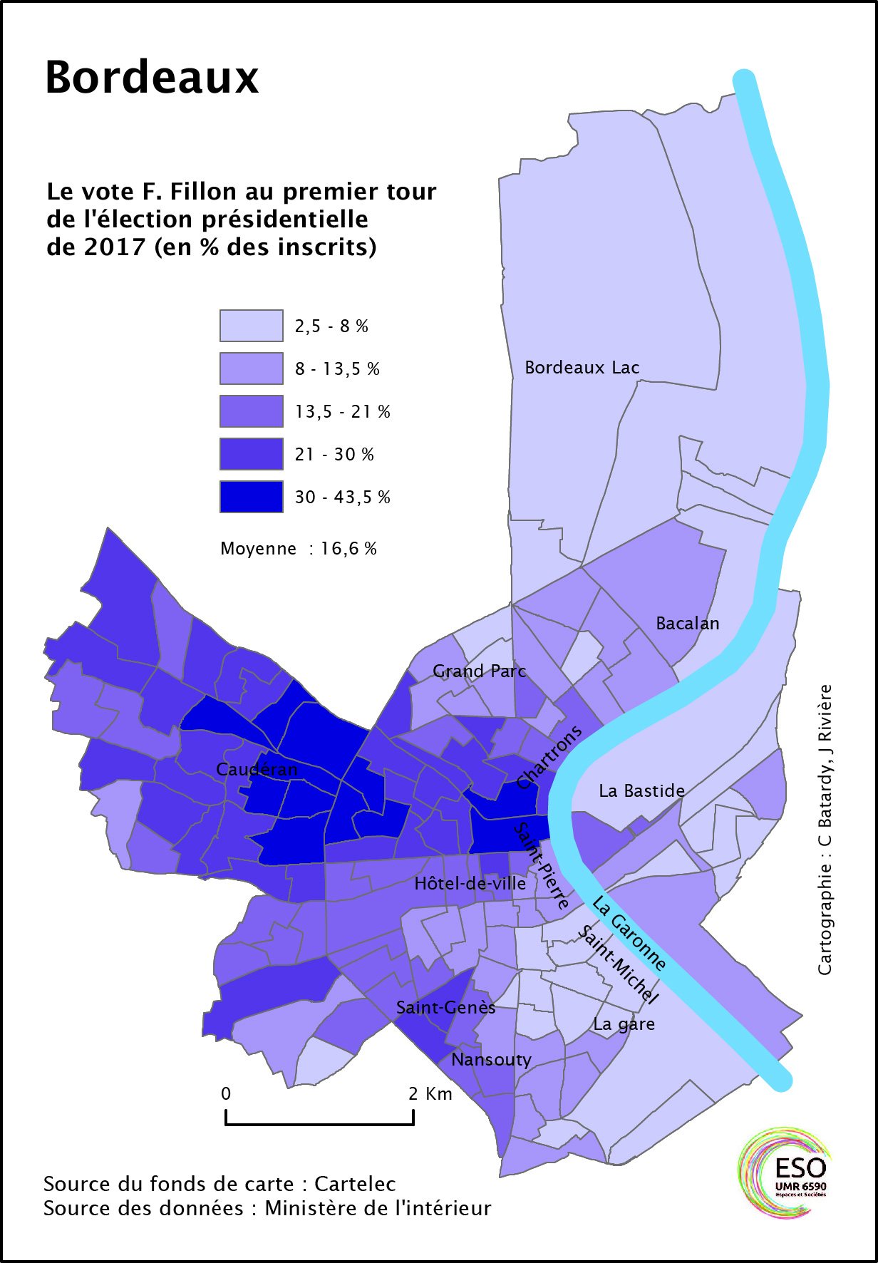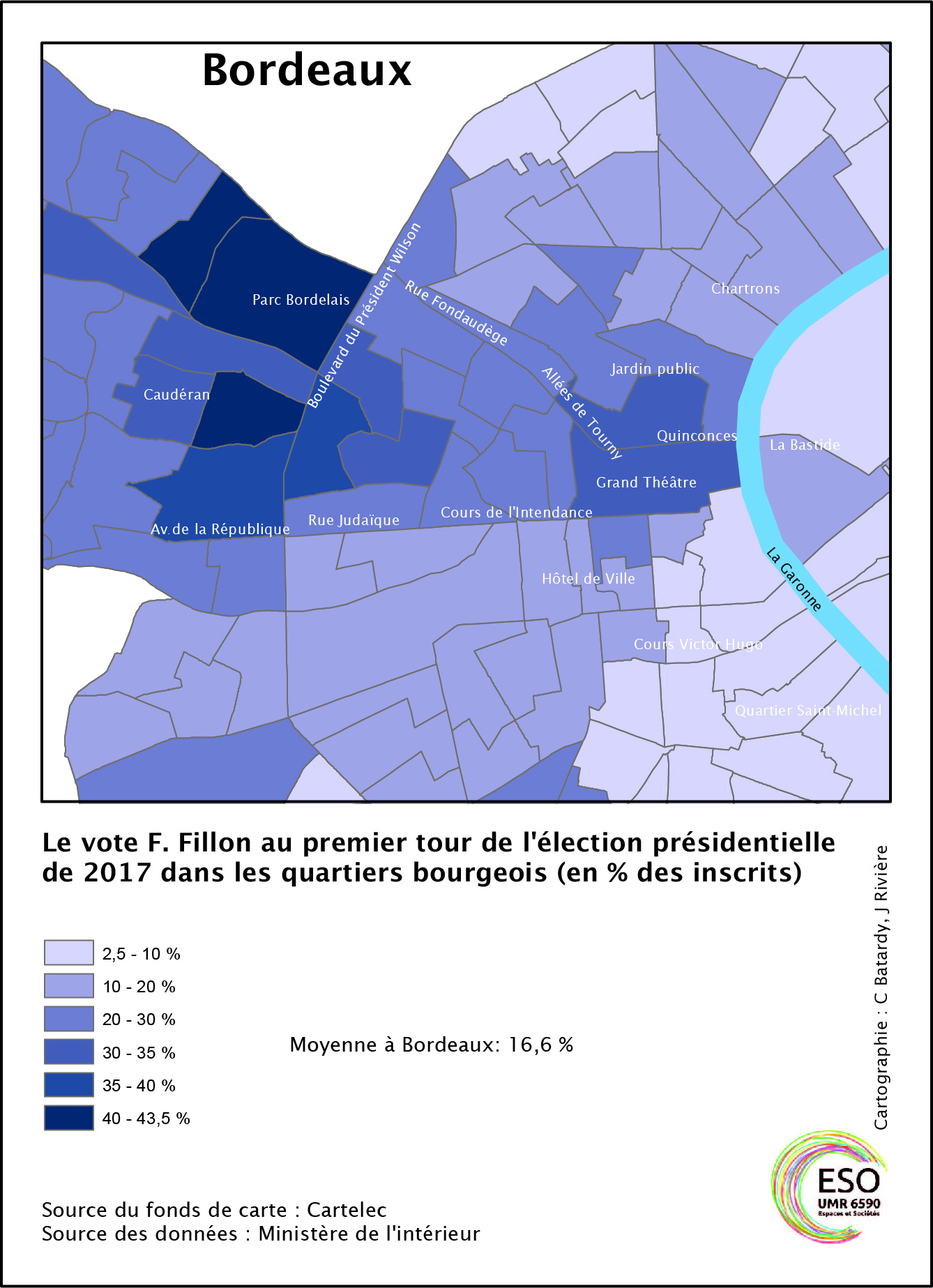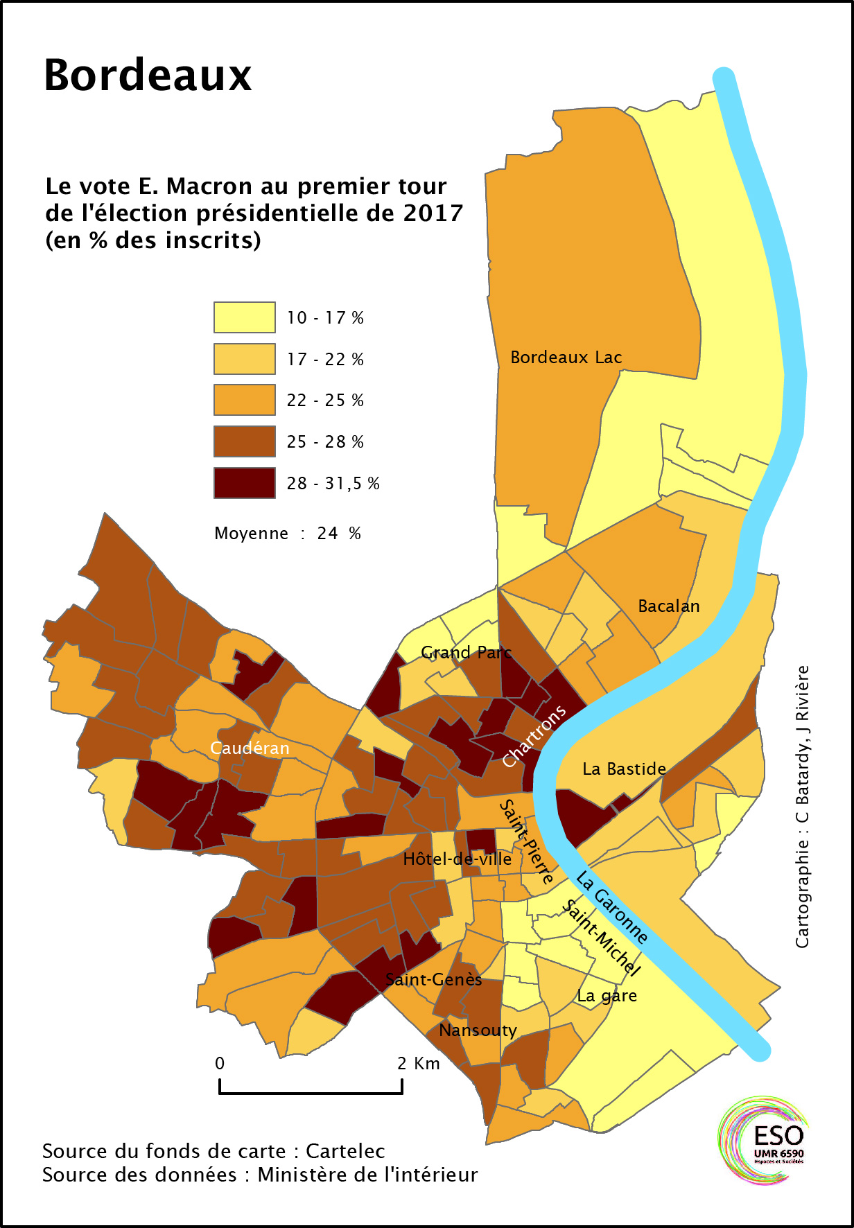 Bordeaux est depuis quelques temps déjà la ville des paradoxes électoraux. [1] Alors qu’elle a pris l’habitude de voter en faveur des candidats de la gauche à la présidentielle, elle n’a jamais élu de maire appartenant à ces tendances depuis la Libération. Successeur de Jacques Chaban-Delmas (maire de 1947 à 1995), Alain Juppé y est ainsi élu et réélu premier magistrat depuis 1995 dès le premier tour de scrutin. Et comme à l’accoutumée, mais de façon plus accentuée encore, le candidat de la droite de gouvernement François Fillon a obtenu un score modeste lors du premier tour de l’élection présidentielle de 2017. Toutefois, à la différence des scrutins de 2007 et 2012, ce n’est pas le candidat de la gauche socialiste qui en a profité mais Jean-Luc Mélenchon et surtout Emmanuel Macron. Le premier est positionné à la gauche du PS ; le second est un concurrent d’une nature nouvelle semblant offrir aux groupes sociaux et aux élites politiques qui dominent la société locale le projet politique dont ils ont toujours rêvé : devenir le laboratoire d’un gouvernement au centre. Par ailleurs, cette élection confirme l’image d’une ville traversée par des clivages socio-politiques et socio-spatiaux plus marqués qu’on ne le pense souvent et dont la traduction en termes électoraux est nette, et ce en dépit des dynamiques de gentrification dont on dit souvent qu’elles aplanissent les fractures politiques au sein de la ville.