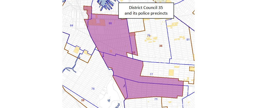 At first glance, District 35 overlaps substantially with three precincts: 88, 77, and 71. However, two additional precincts police two public housing campuses: one in the 79th and one in the 84th. If there were to be an incident of police violence on either of these campuses, community members, including those active on the community board and other local leadership, expect their representative to act. Prior to an incident, Cumbo would not necessarily have a relationship with those precincts, making her vulnerable to defaulting to police authority. If the administration of policing lined up with the administration of all other council-funded business, from youth development to jobs programs, Cumbo might have the relationships and knowledge to counter that authority and problem-solve more effectively.