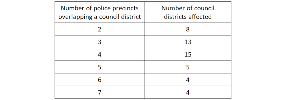 The Office of the Mayor is not a countervailing institution to police power (Vitale 2017). But the New York City Council, with its own democratic mandate and members with local support and relationships, could be. Current political geography, however, makes such a role elusive. Observing spatial mismatch (Solís et al. 2016) between police precincts and the boundaries of council districts alongside the concentration of power between the mayor and NYPD, I hypothesize that a network burden on individual city council members prevents local accountability for police violence, misuse of funds, and the mayor’s overreliance on the NYPD that might produce systemic change. The 2023 Districting Commission should consider how the new district map could better support the council to make critical interventions against policing as policy solution.