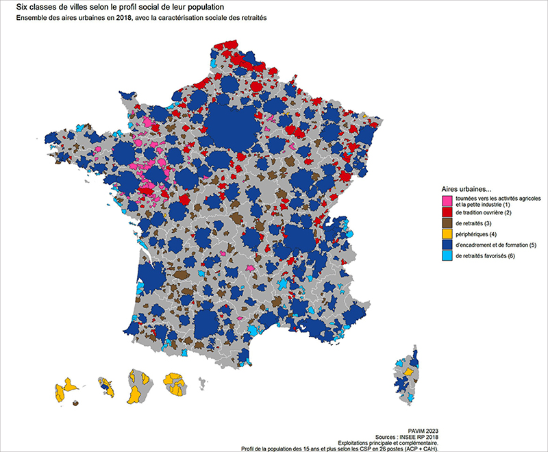 Ce portrait de la structure sociale des aires urbaines françaises permet d’approcher de manière inédite le vieillissement différencié de la population urbaine. Un quart des agglomérations (classe 3) sont marquées par une forte représentation des retraités, quelles que soient leurs PCS. La caractérisation sociale des retraités fait aussi émerger d’autres formes de différenciation : d’un côté, de nombreuses villes petites et moyennes de retraités ouvriers dans la moitié nord du pays (classe 2) et, de l’autre côté, quelques espaces urbains bénéficiant de rentes de situation (littorale et montagnarde) et d’un tropisme touristique qui attire préférentiellement les retraités les plus privilégiés et mobiles, notamment les anciens cadres (classe 6). Dans les autres classes, la place des retraités est plus discrète et les combinaisons d’actifs font ressortir différentes catégories : agricoles et petites industries (classe 1), secteur public et inactifs (classe 4), fonctions de centralités (classe 5). Cette typologie nuance l’idée d’exceptionnalité des grandes métropoles, qui appartiennent à la même classe que nombre de villes petites et moyennes hébergeant des activités de formation ou les classes d’encadrement.