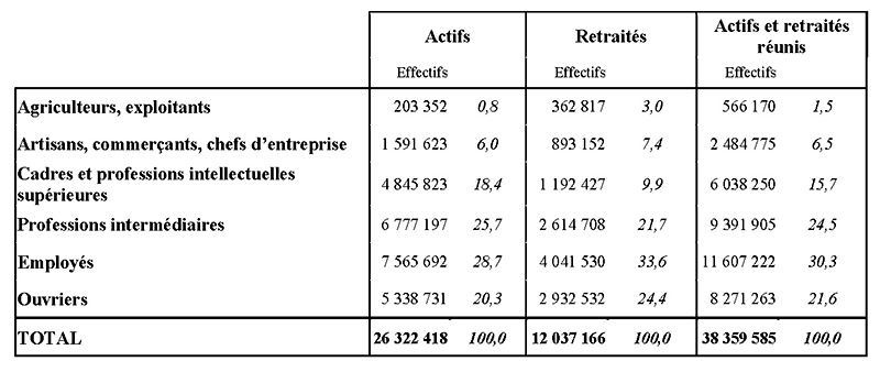 Comment la composition sociale et professionnelle des villes françaises se transforme, une fois intégrée l’ancienne vie professionnelle des retraités ? Le tableau suivant présente les effectifs des actifs et des retraités pour les six grands groupes socioprofessionnels (à l’exclusion ici des inactifs).