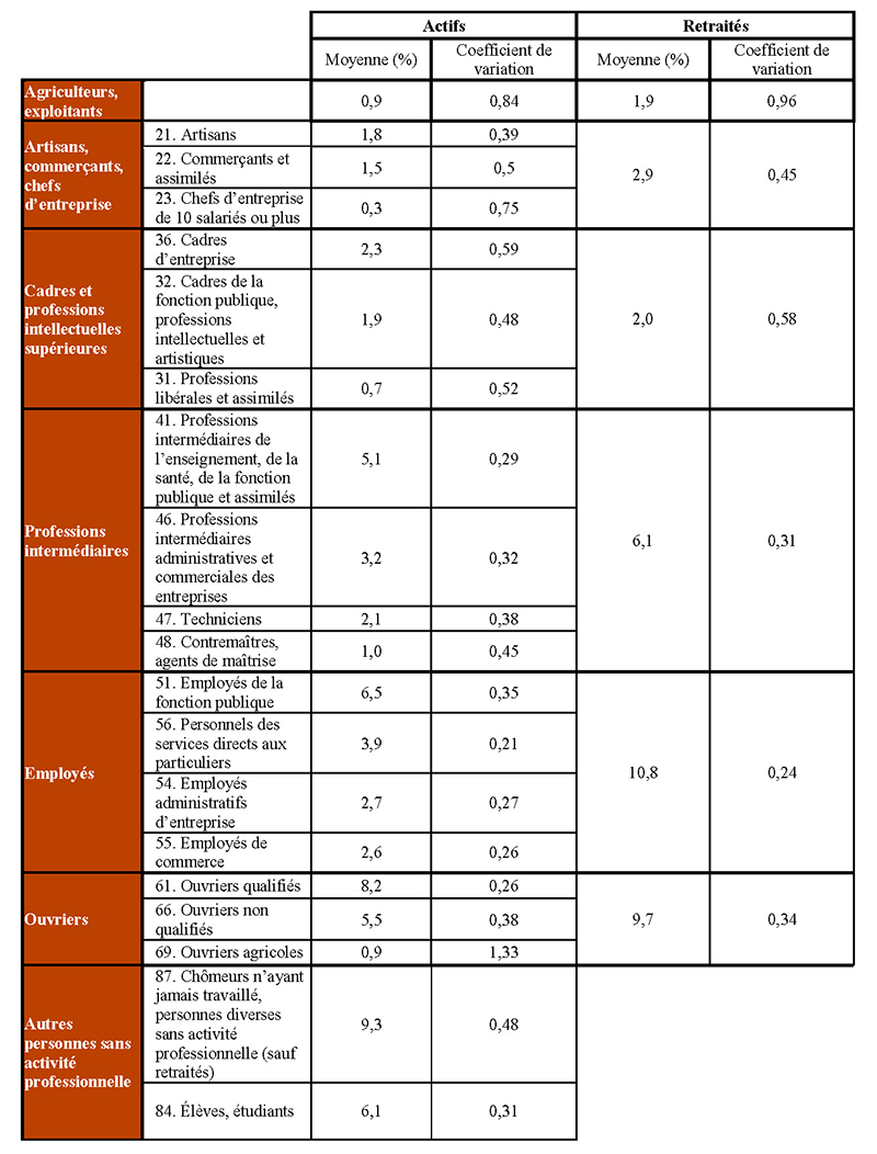Derrière ce portrait social se cache une grande diversité de profils pour les villes étudiées : le tableau 2 en donne une première preuve avec les valeurs moyennes de la répartition des 15 ans et plus en vingt-six PCS et la dispersion statistique associée (coefficient de variation) pour les 789 AU. À cette échelle, les catégories les plus représentées sont les anciens employés (10,8 % en moyenne), les anciens ouvriers (9,7 %), les inactifs (9,3 %, sans les étudiants), les ouvriers qualifiés (8,2 %) et les employés de la fonction publique (6,5 %), et les retraités des professions intermédiaires (6 %) [3].