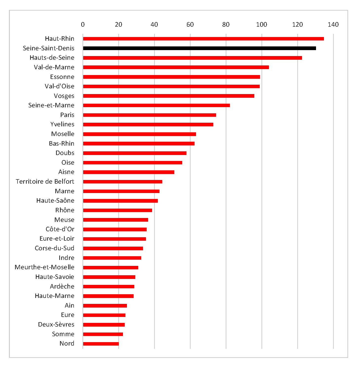 Covid‑19 has thus affected Seine-Saint-Denis more than other départements in the Paris region, and more even than the eastern Haut-Rhin département (one of the worst-affected in France at the start of the pandemic), but the health crisis and the way it has been managed politically have also had a greater impact here than elsewhere on the deterioration of the “physical, mental, and social” health of its inhabitants and the increase in accumulated inequalities. To understand the amplified effects of the epidemic in Seine-Saint-Denis, it is therefore imperative to objectively identify funding inequalities—in this case, the under-resourcing of the département in terms of health facilities and budgets compared to the rest of the country (Amdaoud et al. 2020), in a context where the population’s access to basic rights and health care is more limited than elsewhere (see “Covid‑19 in Seine-Saint-Denis (2/2): How the Health System Increases Inequalities”, forthcoming).