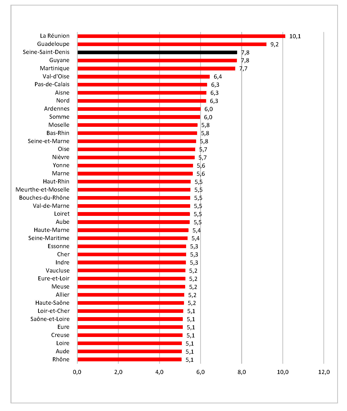 These particularly poor health situations can be explained by an accumulation of social inequalities, as demonstrated in particular by the incidence of occupational cancers (Marchand 2016) in Seine-Saint-Denis. Unemployment in the département is high and service-sector jobs are numerous, indicating the prevalence of certain kinds of working conditions. The salaried working classes (white-collar and blue-collar workers) represent 55% of the active population (compared to 47.9% in France as a while), while 61.4% work in construction, retail, transportation, and services (compared to 53% nationally). It is also the département with the highest proportions of foreign (23%) and immigrant populations in France (Figure 3).