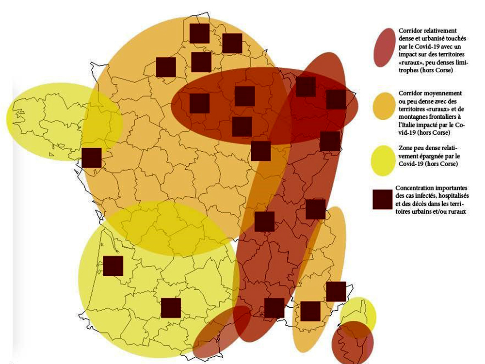 Cet article s’appuie sur les cartes du Commissariat général à l’égalité des territoires (CGET) et notamment sur celle illustrant les « Campagnes des villes, du littoral et des vallées urbanisées », afin de distinguer les espaces urbanisés de différents espaces ruraux. Les campagnes désignent les territoires ruraux, c’est-à-dire ceux qui sont peu densément peuplés, avec un nombre d’habitants au kilomètre carré relativement moyen ou faible (entre 10 et 40 hab./km²). Les villes, quant à elles, sont ici pour l’essentiel les métropoles (Paris, Lyon, Strasbourg, Marseille, Bordeaux, Toulouse, etc.) et leur périphérie (villes et villages sous influence urbaine). Ce sont des territoires densément peuplés (entre 113 et 3 000 hab/km²). L’utilisation des outils et données cartographiques semble être un atout pour comprendre la dynamique de propagation du virus dans ces territoires et l’interrelation indiscutable entre ces derniers. Les éléments ci-dessous apportent donc une observation géographique à la compréhension de la propagation du virus sur le territoire français en s’intéressant à l’occupation de l’espace, aux enjeux de la densification des espaces urbanisés, ainsi qu’à la typologie des lieux urbanisés et ruraux et aux mobilités quotidiennes.