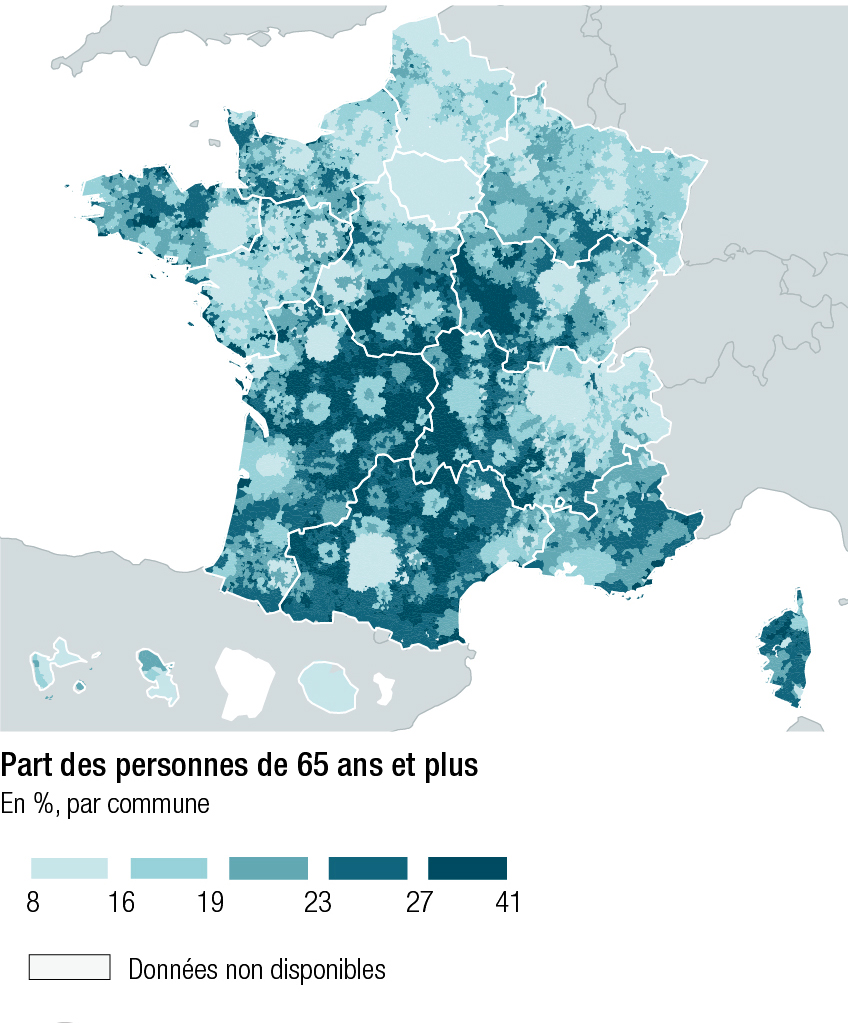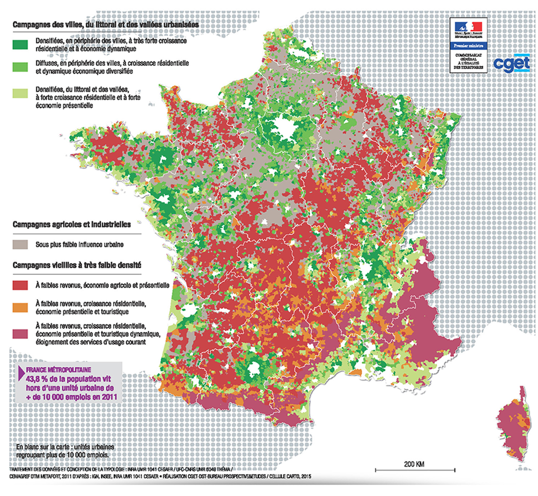 – les cartes du Commissariat général à l’égalité des territoires, ou Agence nationale pour la cohésion des territoires (CGET-ANCT), qui catégorisent les campagnes françaises, identifient la part des personnes âgées dans les territoires et l’accès aux soins ;