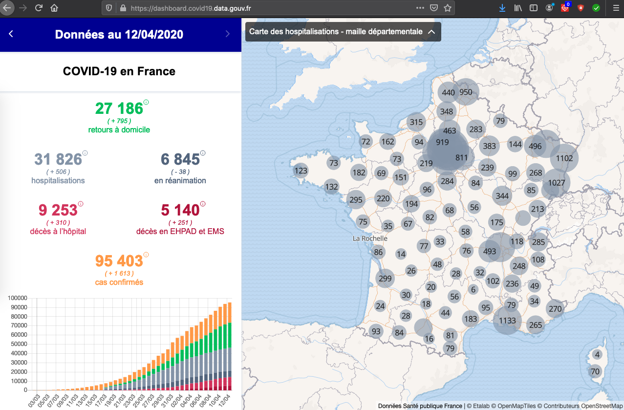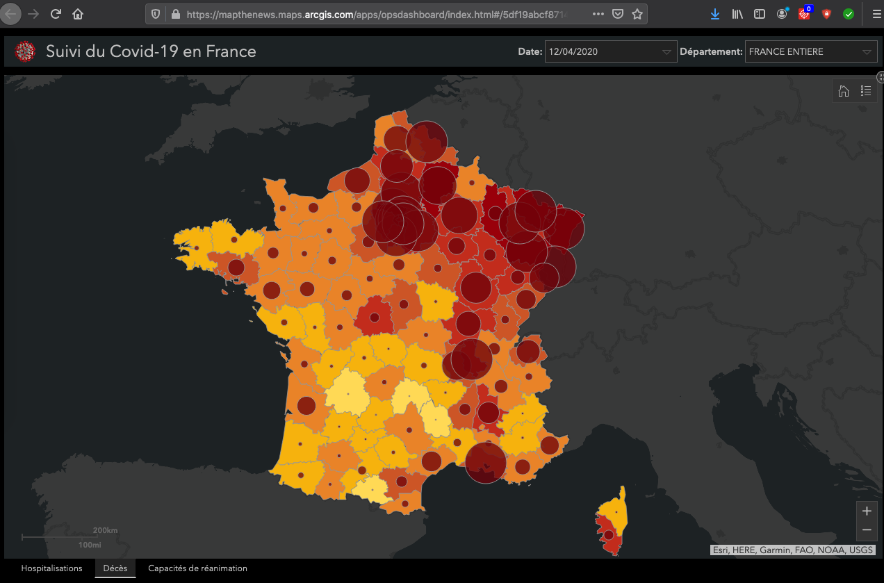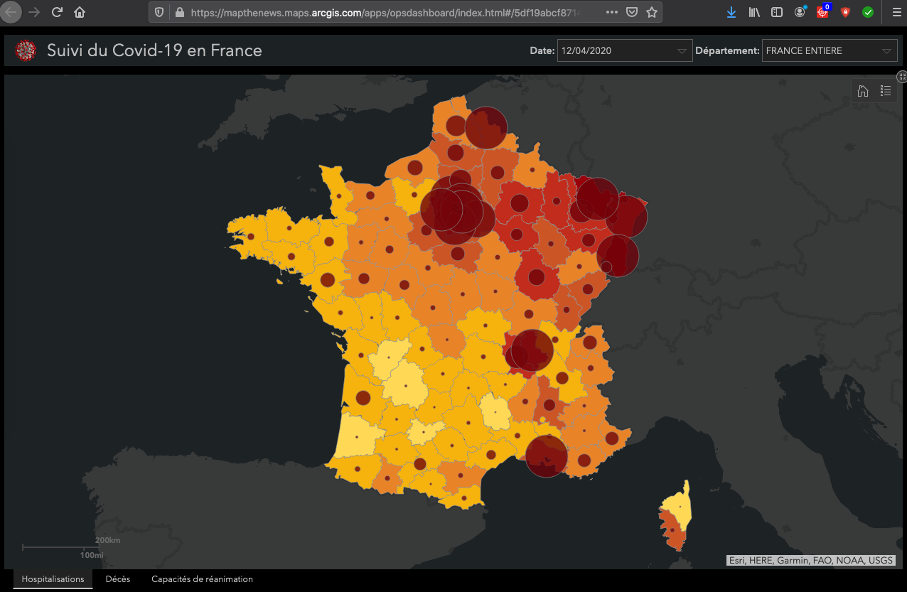 – les cartes du gouvernement et de l’Environmental systems research institute (ESRI-France), basées sur les données de Santé publique France relatives au Covid-19 et montrant les cas hospitalisés, les décès et le nombre de lits en réanimation disponibles par département ;