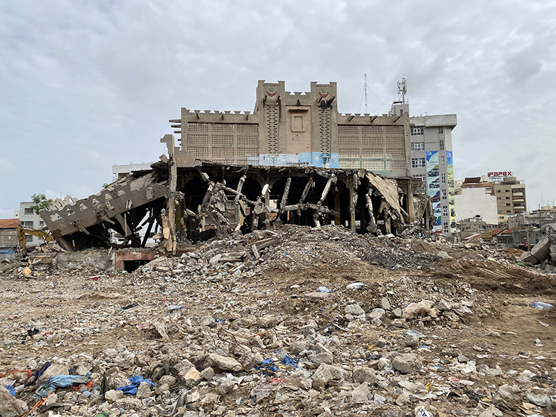 Carole Diop and Xavier Ricou devote fascinating pages to Dakar’s rich architectural history and strong cultural identity. Since its establishment, Dakar has been adorned with buildings inspired by various styles and periods. The authors classify these into five categories: the International Style, Modernism, Brutalism, “African Modernism” or “Critical Regionalism,” and Colonial Architecture. The city has also been profoundly influenced by neo-Sudanese architecture, of which Sandaga market—which was demolished in 2021—was a notable example (Figure 10).