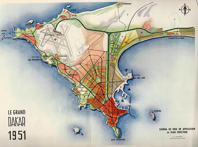 In their book Dakar, métamorphoses d’une capitale, Senegalese architects Carole Diop and Xavier Ricou present a masterful exploration of Dakar. Through meticulous archival research and iconography, the authors explore the lesser-known history of the former West African colonial capital, analyze its influence on the African continent and beyond, and examine the numerous projects that are transforming the city. They also invite readers to revisit the city’s rich heritage in order to better anticipate its future. Dakar, métamorphoses d’une capitale is not just a beautiful book; it is also a comprehensive research project, bringing together a wealth of previously unpublished information and documents on Senegal’s capital city within a single volume. [1]