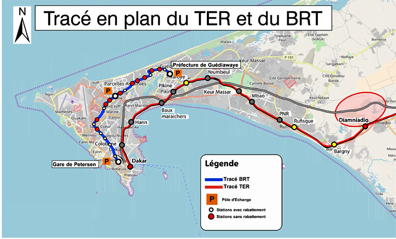 Ten years later, after expropriation and land disputes (Lavigne Delville and Diongue 2024), the first institutions were built in the ministerial precinct, the first matches were played in the stadium, the first students graduated from the polytechnic university and the first inhabitants moved into the residential areas (Figure 6). Meanwhile, transport infrastructure is being planned to ease congestion on the Plateau and Cap-Vert peninsula (Figure 7). The Regional Express Train (Train Express Régional, TER) line (Kopf 2020), which runs parallel to the motorway, will serve suburban communities, the new town, and the airport. In May 2024, the Bus Rapid Transit (BRT) system—which has an exclusive right of way—began operating, running from north to south across the peninsula (Figure 8).