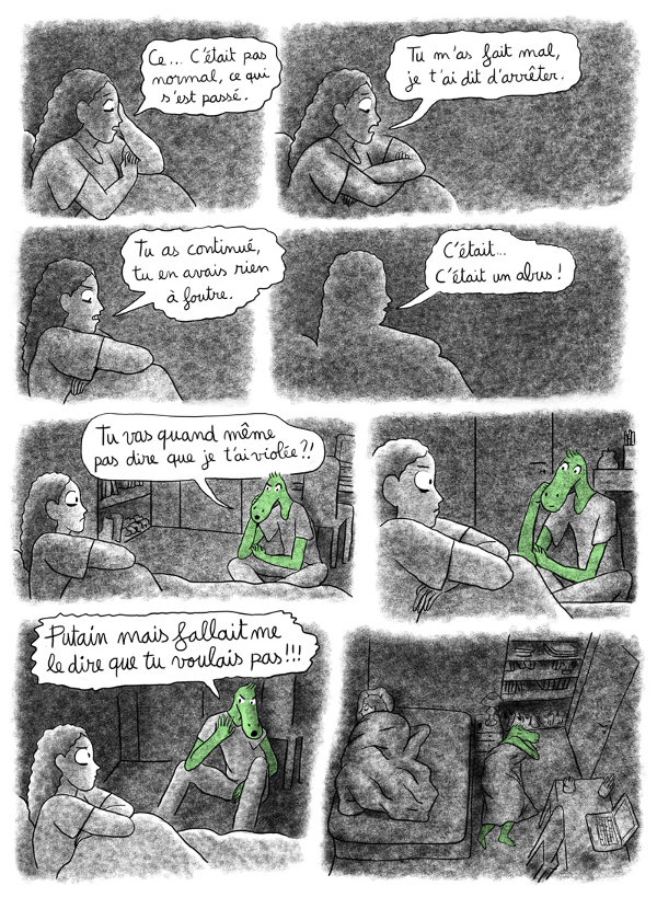 Un bon nombre d’histoires se déroule dans ce qu’il est convenu d’appeler la sphère privée, à domicile, dans la vie quotidienne ou lors de fêtes chez des amis. Ce ne sont pas les moins perturbantes, car elles mettent en scène tant le harcèlement ou le viol par un petit ami ou un conjoint (figure 2) que l’incompréhension de l’entourage, qu’il s’agisse d’hommes mais aussi de femmes.