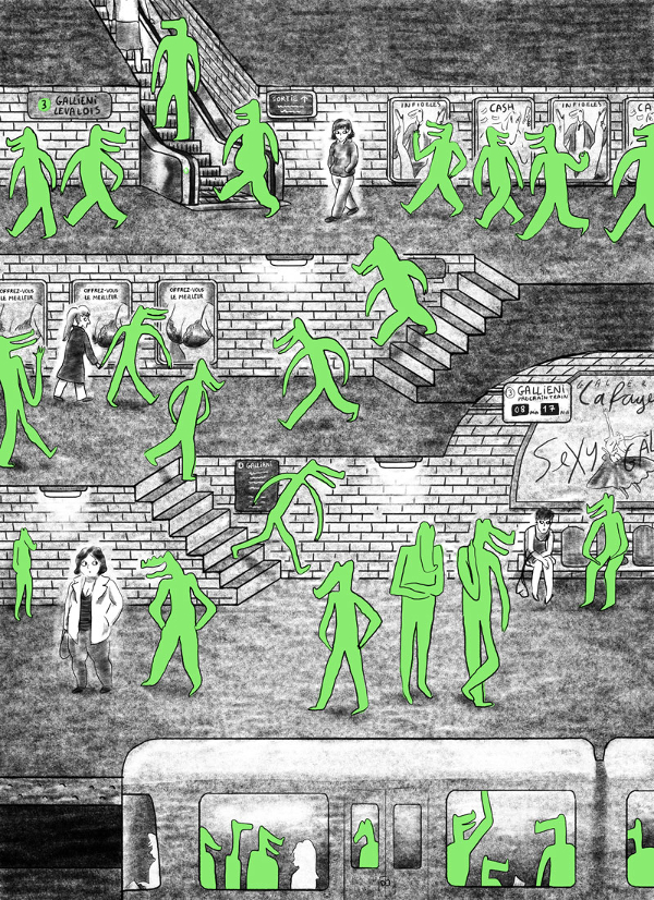 L’objet principal de la bande dessinée de Thomas Mathieu, Les Crocodiles, est le harcèlement sexuel dont sont victimes les femmes. Celles-ci sont représentées de façon anthropomorphique, alors que l’auteur a choisi de dessiner les hommes comme des crocodiles, pour signifier leur comportement prédateur. Le parti pris de représenter les hommes sous la forme d’un animal permet aux lecteurs de se mettre « dans la peau » d’une femme victime de comportements que les hommes peuvent croire anodins, mais qui s’avèrent démesurément inquiétants ou agressifs pour les passantes, voire pour les conjointes. Comme les crocodiles dessinés ne présentent pas de traits distinctifs en termes d’âge, d’origine ou de classe, le lecteur ne peut considérer que le problème ne les concerne pas, ni eux ni leur milieu social ou leur propre entourage (figure 1) [1].