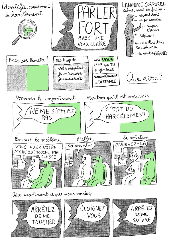 La partie intitulée « Témoignages » occupe les trois premiers quarts de l’ouvrage. Ceux-ci se succèdent en autant d’histoires racontées dans des formats différents, allant d’un dessin unique sur une seule page jusqu’à une bande dessinée sur plusieurs pages. Dans cette partie, les seuls textes sont les bulles représentant ce qu’expriment, pensent ou ressentent les personnages. Ensuite commence une section « Stratégies » d’une vingtaine de pages, où l’auteur s’exprime à la première personne et livre son analyse et ses préconisations dans des textes qui encadrent les dessins. Enfin, dans la dernière section, le format change encore, pour laisser place à quatre textes, illustrés par l’auteur, écrits par des activistes de la cause féministe : Lauren Plume, Irène Zeilinger, Anne-Charlotte Husson et le collectif « Stop harcèlement de rue ».