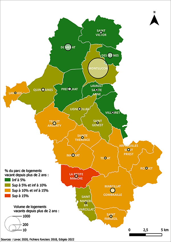 Premièrement, on observe une augmentation du nombre de logements vacants dans plusieurs communes en première couronne de Montluçon (par exemple : Domérat, Saint-Victor). Dans ces communes pourtant attractives, l’augmentation du nombre de logements neufs a accentué l’écart entre l’offre et la demande, générant une détente du parc. De plus, les logements vacants situés dans les secteurs bâtis les plus anciens sont parmi les plus difficiles à remettre sur le marché (absence de luminosité et d’extérieur, difficultés d’accès, etc.).