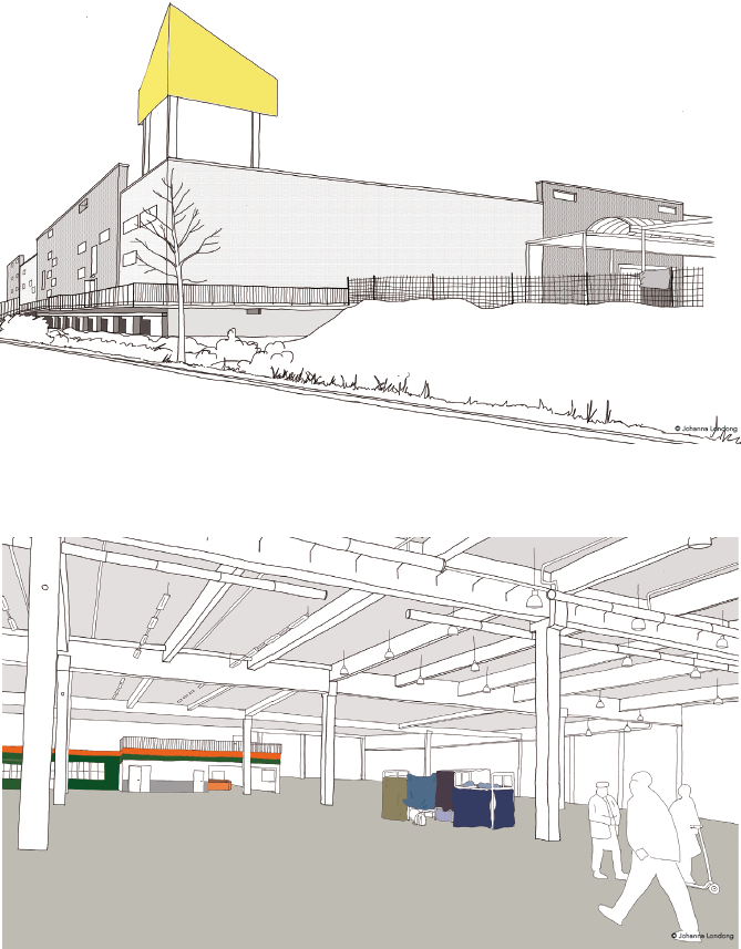 At the same time time, aid infrastructures developed around the camp, and volunteers found their way into the former meat-processing facility. Language courses, cafés and activities were offered; locales were used and set up for refugees. There were three different types of space around the camp: (1) pre‑existing institutions, such as the public library or community colleges, which extended their services, offering language courses; (2) newly founded places like refugee cafés, enabling contacts between refugees and residents; and (3) spaces like parks, squares or shopping malls, freely accessible and most of them without the pressure of consumption.