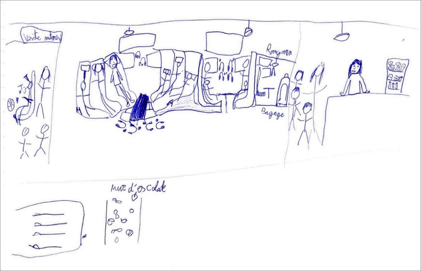 La plupart des dessins récoltés présentent le train idéal comme doté d’outils numériques en libre accès. Clément (7 ans) propose par exemple un train avec « beaucoup de réseau » pour contrer les problèmes de connexion rencontrés lors de son trajet. Les dessins de Charlotte (9 ans) et de sa sœur Myrtille (13 ans) montrent la place qu’elles souhaitent donner aux écrans dans leurs trajets en train : pour les deux sœurs, un train idéal suppose un accès aux écrans libérés de la contrainte parentale. Charlotte dessine ainsi des tablettes numériques et des casques pour chacun des passagers (figure 1). Symboliquement, les tablettes numériques se trouvent là où on imaginerait les fenêtres du train. Dessinées au-dessus des sièges, les fenêtres semblent avoir été ajoutées ensuite. Myrtille, quant à elle, propose une salle numérique : « Papa, il est pas toujours d’accord [pour mettre un film] alors que comme ça on pourrait faire ce qu’on veut. »